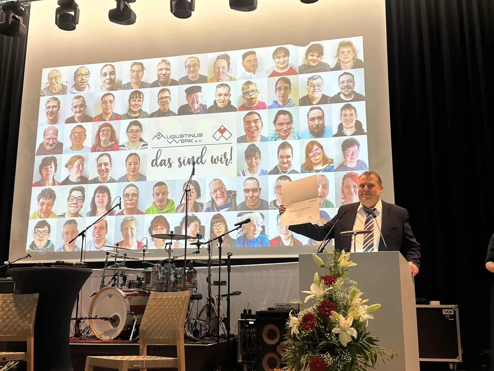 Matthias Monecke, seit 2011 Geschäftsführer und Vorstand des Augustinuswerks, zog Bilanz über die jüngsten Herausforderungen: Die vergangenen Jahre hätten das Werk mehrere Millionen Euro gekostet, doch heute sei man „für die Zukunft sauber aufgestellt“ und bereit, jede Krise zu meistern. Eindrücklich wurde die Vielfalt des Augustinuswerks auf der Leinwand sichtbar: 60 Gesichter stellten stellvertretend die Mitarbeitenden und Klienten dar. In einem kurzen Film präsentierten sich fünf verschiedene Klienten für fünf verschiedene Bereiche, um die Vielfalt der Arbeit im Augustinuswerk zu demonstrieren.
