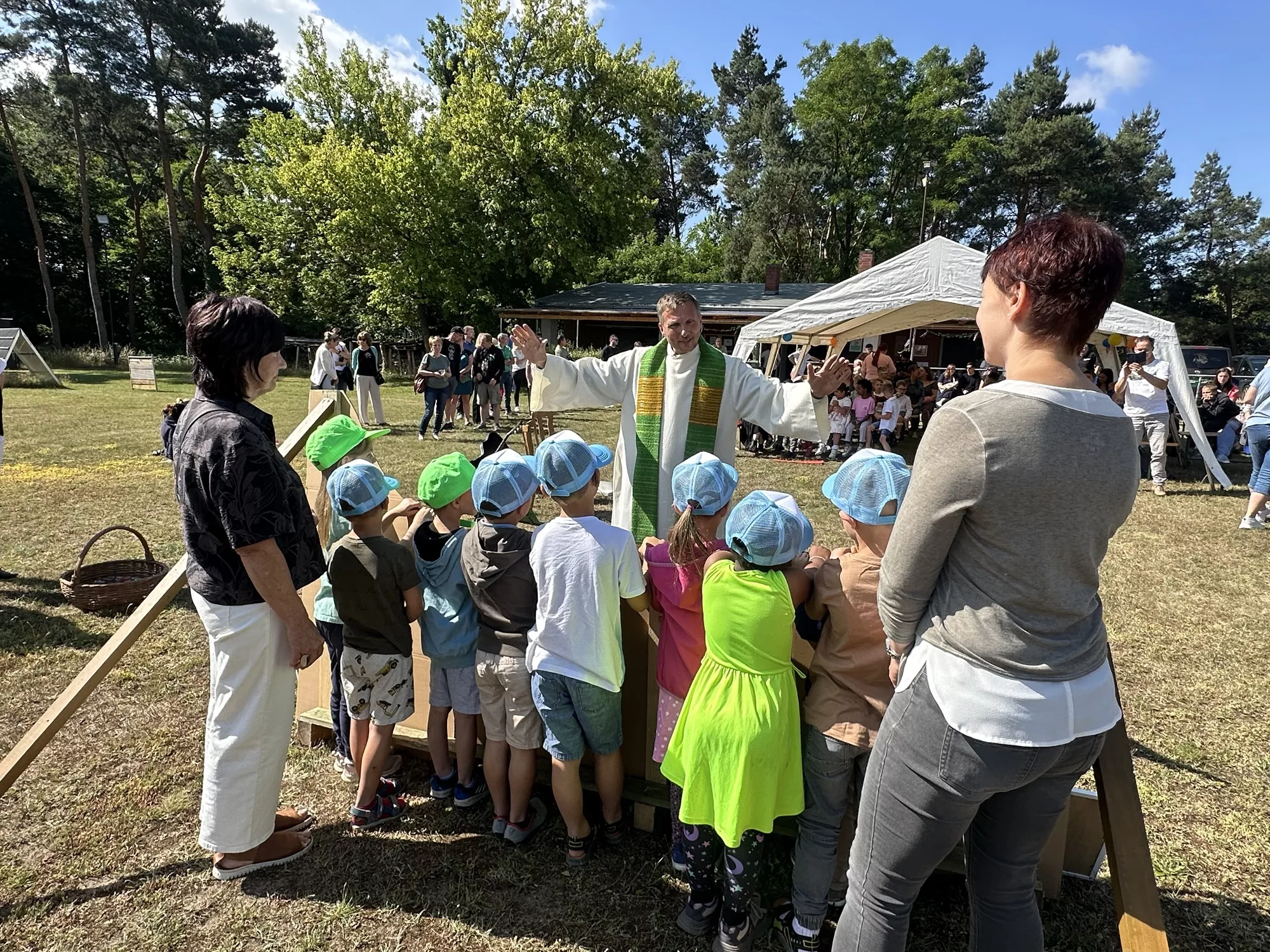 Pfarrer Guido Merten segnet die Kinder feierlich unter freiem Himmel.