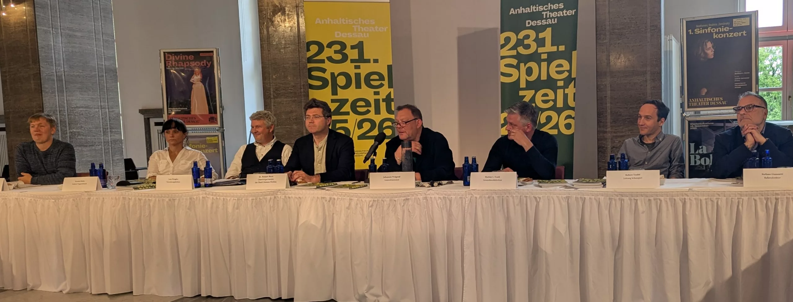 Generalintendant Johannes Weigand und Verwaltungsdirektor Lutz Wengler stellten gemeinsam mit den Spartenleitern die Premieren, Konzerte, Wiederaufnahmen, Gastveranstaltungen und Events der 231. Spielzeit des Anhaltischen Theaters vor. 18 Premieren, 17 Wiederaufnahmen sowie zahlreiche sinfonische Konzertprogramme und Zu-Gast-Veranstaltungen in Hülle und Fülle warten auf ihren großen Auftritt zur Saison 2025/2026.