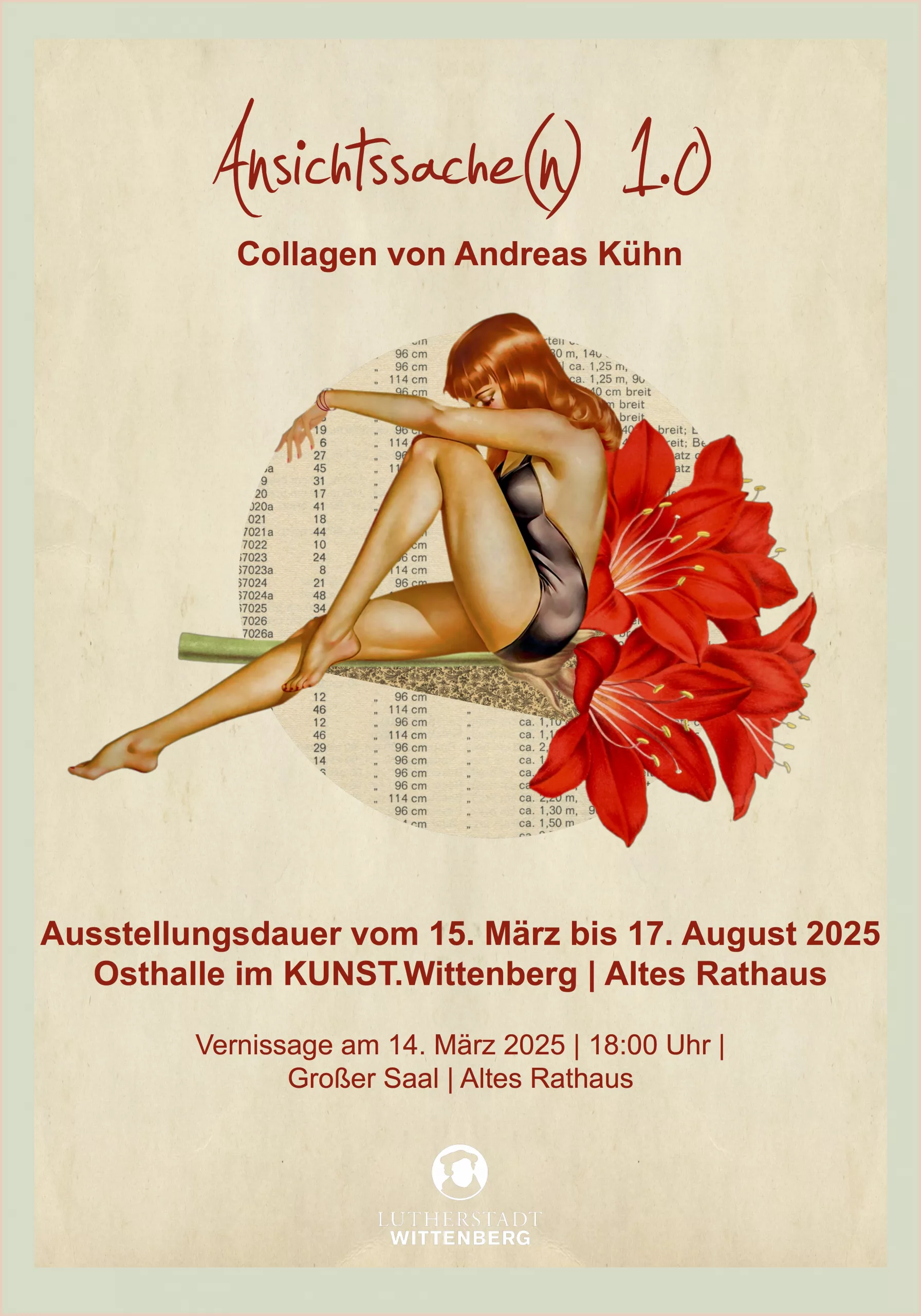 Der 1966 in der Lutherstadt Wittenberg geborene und bis heute hier lebende Künstler Andreas Kühn hat viele Jahre als selbstständiger Mediendesigner für Digital- und Printmedien gearbeitet. Im Jahr 2013 hat er sich dann ganz der Kunst gewidmet. Zunächst hat er sich mit Fotografie und traditionellen Drucktechniken ausprobiert und schließlich die Collage als bevorzugte Ausdrucksform für sich entdeckt. Ein Wendepunkt in seinem Leben war eine schwere Operation Anfang 2017. Diese Erfahrung führte zu der Entscheidung, sich vollständig der Kunst zu widmen – eine Entscheidung, die seinen Schaffensprozess nachhaltig prägte. Foto: Plakat zur Ausstellung