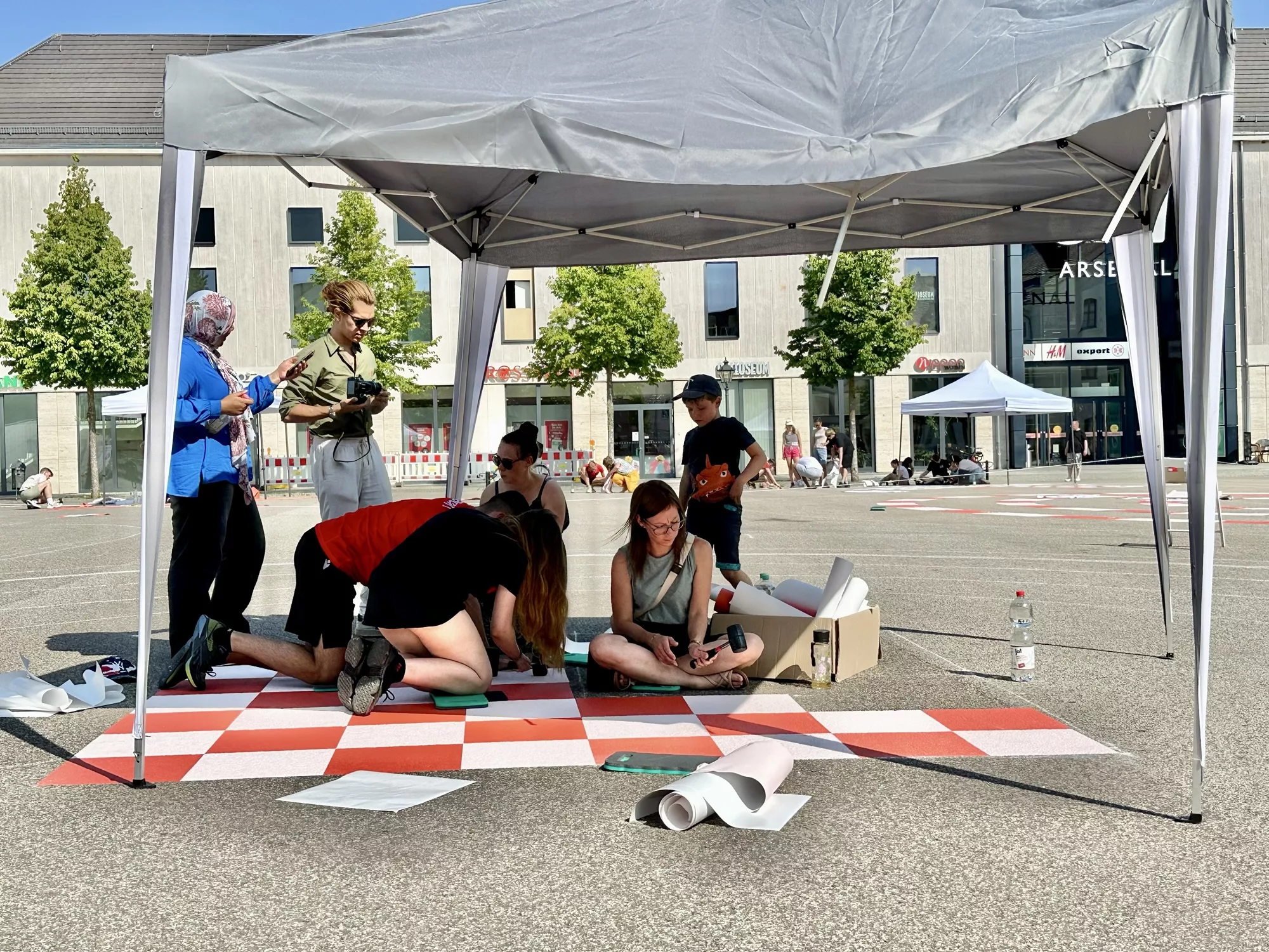 Auch Barbara Kaiser selbst griff zum Hammer: „Ursprünglich wollte ich die Spiele nachhaltiger in den Wallanlagen oder der Schlosswiese anlegen – aber ich freue mich sehr, dass es hier verwirklicht wurde. Es ist ein Projekt für alle Menschen. Mit dem „Spielfeld Stadt“ ist der Arsenalplatz bunter geworden.“