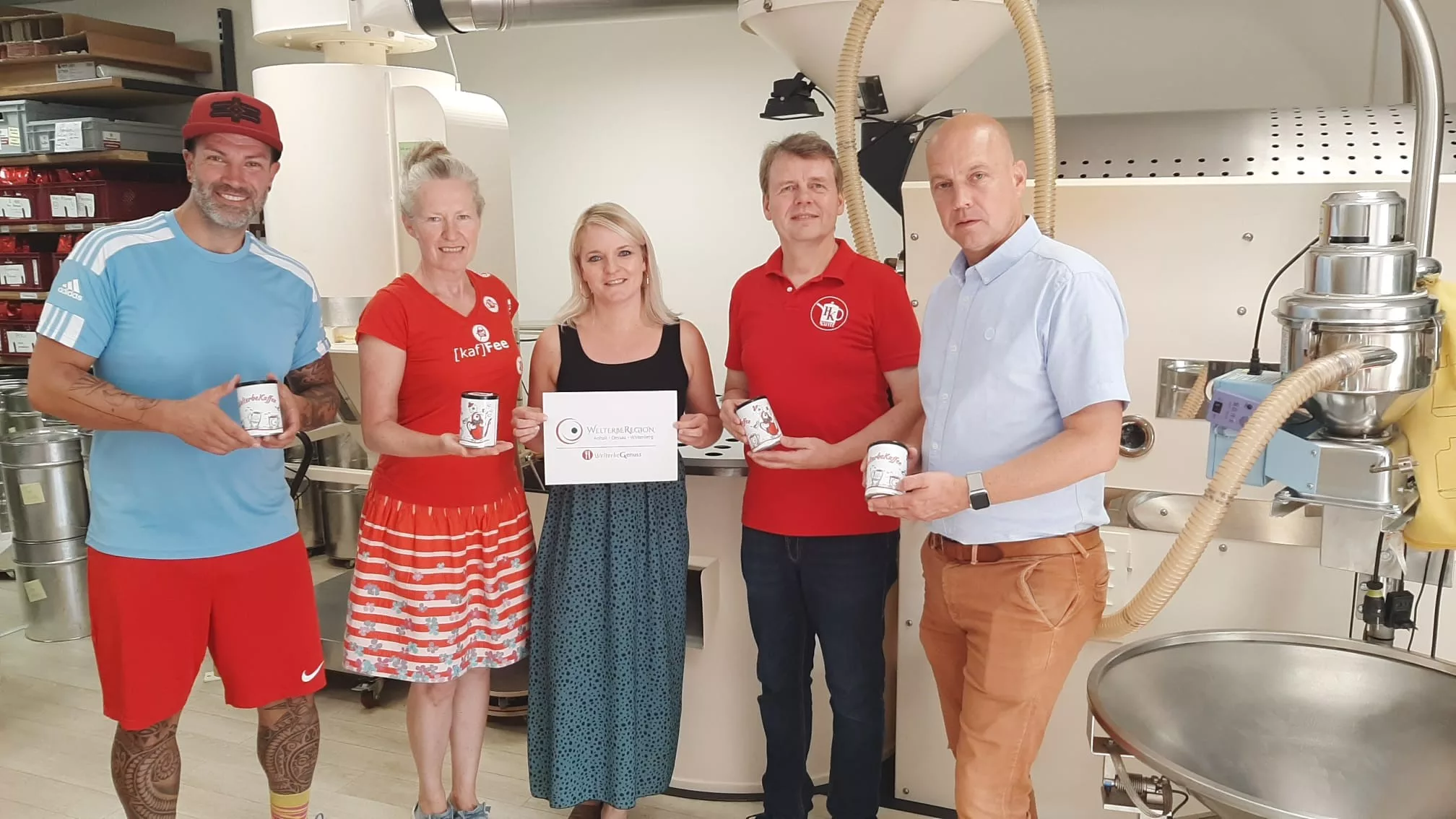 Bild: Präsentation des WelterbeKaffees zum Auftakt der neuen Kampagne: Thomas Schatz, Kaffeemänner Aschersleben, Antje Fuchs, Kaffeerösterei Hannemann, Anika Kinnemann, stellvertretende Geschäftsführerin WelterbeRegion, Torsten Vogel, Kaffeerösterei Hannemann und David Rieck, Vorstand WelterbeRegion (v.l.n.r.). Foto: © WelterbeRegion Anhalt-Dessau-Wittenberg