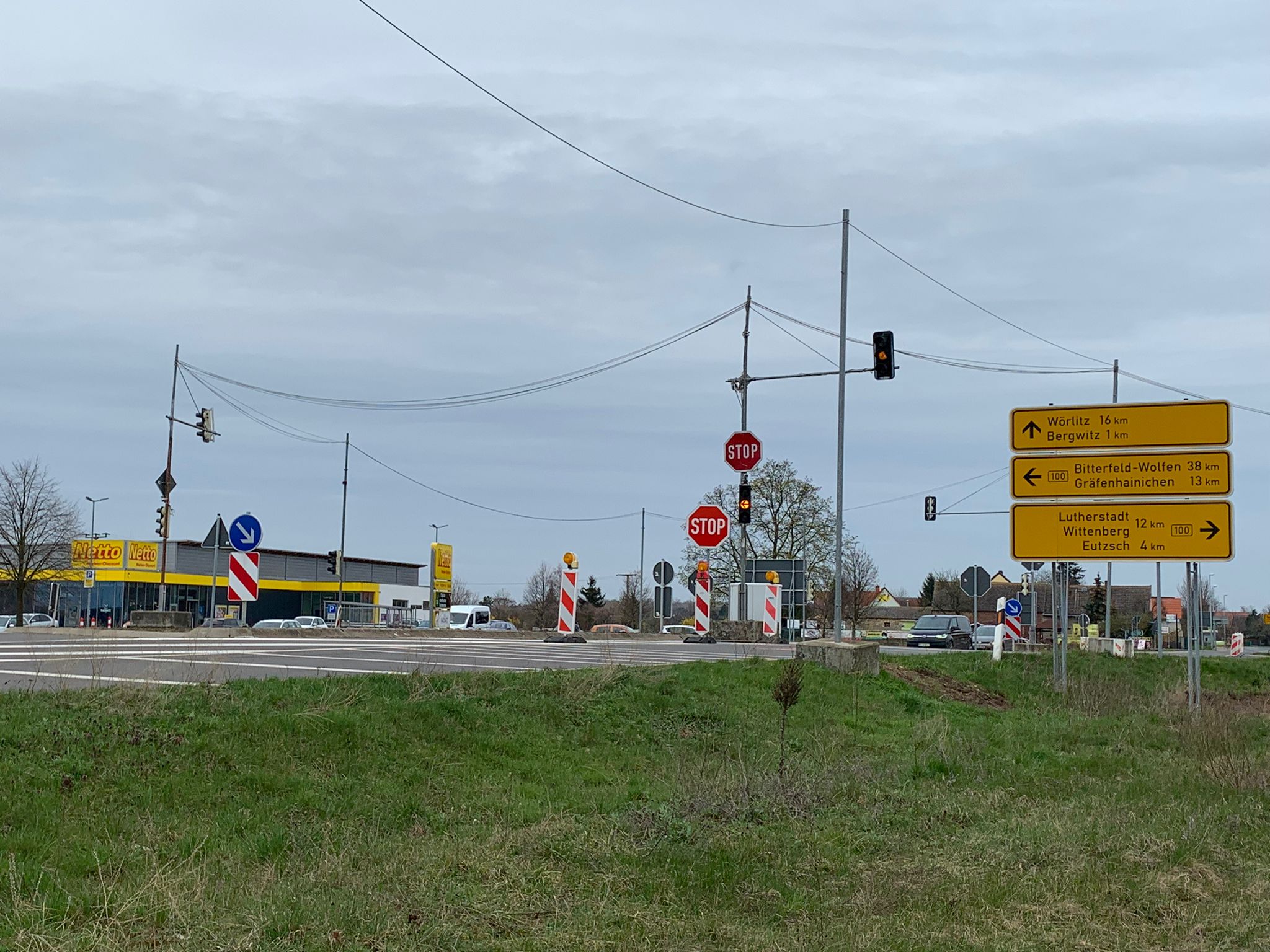 Die Kreuzung, an der sich zahlreiche schwere Unfälle ereignet hatten und an der zuletzt der Verkehr von einer Ampelanlage geregelt wurde, soll bis zum Jahresende 2023 zu einem Kreisverkehr umgebaut werden. Nach derzeitigem Planungsstand hat das Straßenverkehrsamt der Kreisverwaltung Wittenberg die Baustelle und die daraus resultierenden Umleitungsstrecken und Sperrungen bis zum 23. Dezember 2023 genehmigt.