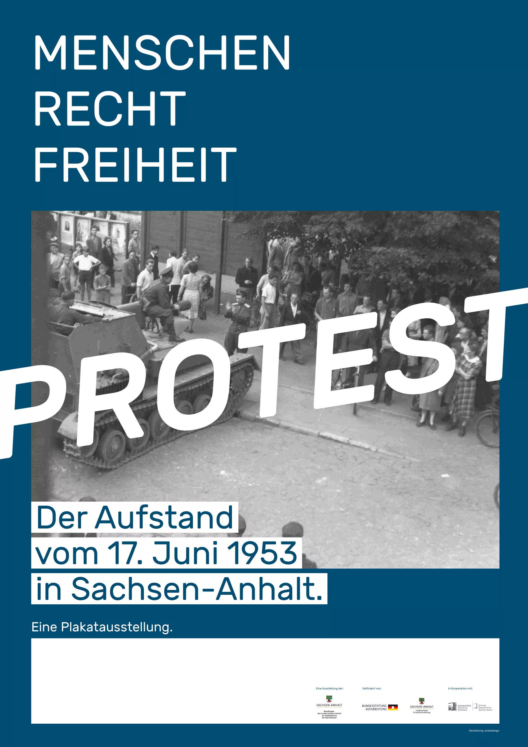 Die Ausstellung „Menschen Recht Freiheit Protest. Der Aufstand vom 17. Juni in Sachsen-Anhalt“ wurde vom Beauftragten des Landes Sachsen-Anhalt zur Aufarbeitung der SED-Diktatur erstellt und von der Bundesstiftung zur Aufarbeitung der SED-Diktatur und der Landeszentrale für politische Bildung in Sachsen-Anhalt gefördert. Die Öffnungszeiten sind: Montag, Mittwoch, Freitag von 8.00 bis 12.00 Uhr sowie Dienstag und Donnerstag von 8.00 bis 18.00 Uhr. Der Eintritt ist frei. Bei der Besichtigung der Ausstellung können das Begleitheft zur Ausstellung als auch die vom Landesarchiv Sachsen-Anhalt herausgegebene Publikation zum 17. Juni 1953 in Sachsen-Anhalt kostenfrei mitgenommen werden.
