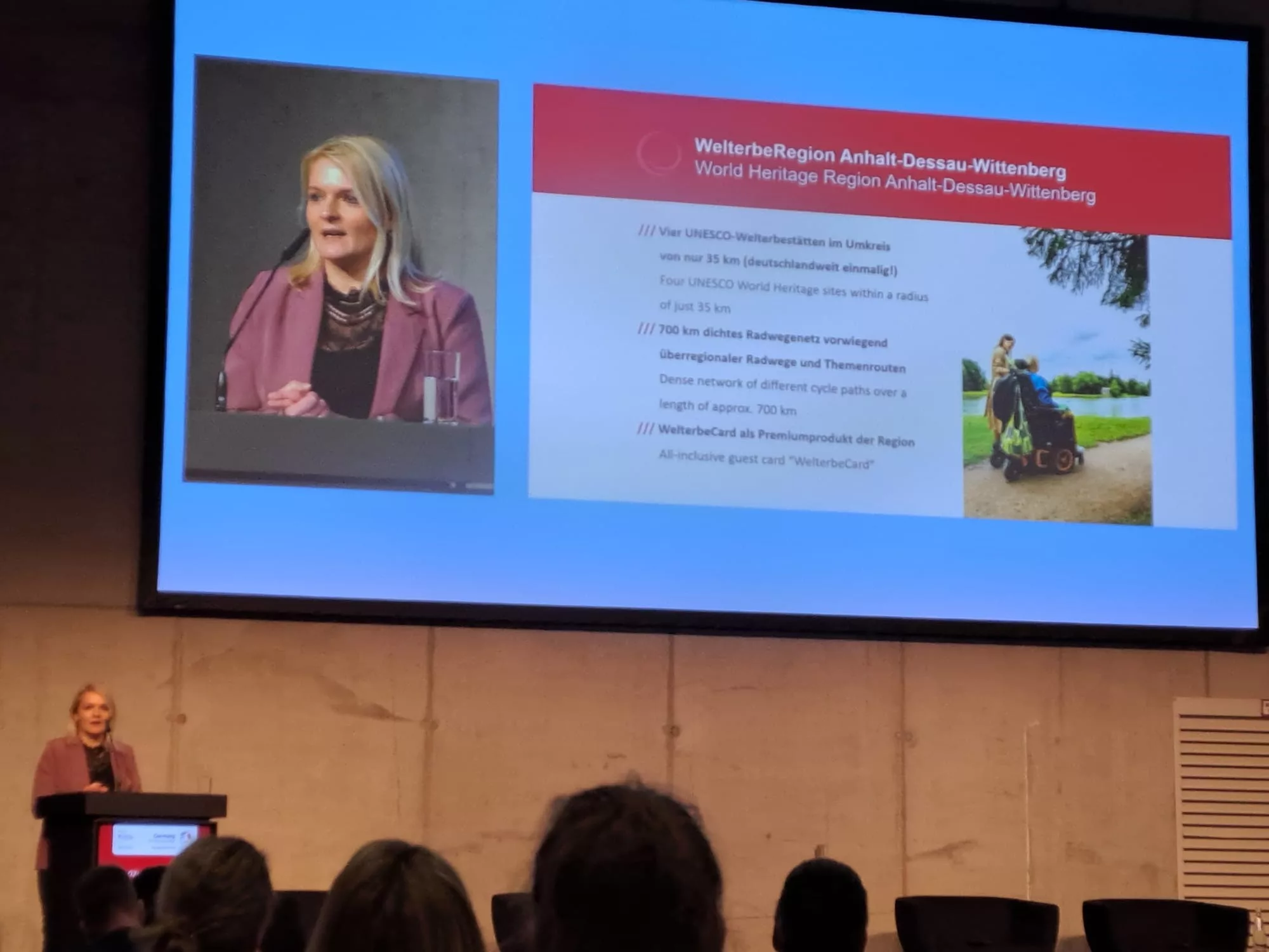 Aus Sachsen-Anhalt setzte sich nach Vorauswahl der touristische Regionalverband WelterbeRegion Anhalt-Dessau-Wittenberg e.V. durch, um über die barrierefreie Entwicklung der WelterbeRegion als nachahmenswertes Beispiel zu berichten. Dies übernahm die stellvertretende Geschäftsführerin, Anika Kinnemann, die im Rahmen des Themenpanels „Barrierefreie Destinationsentwicklung“ einen Impulsvortrag hielt.