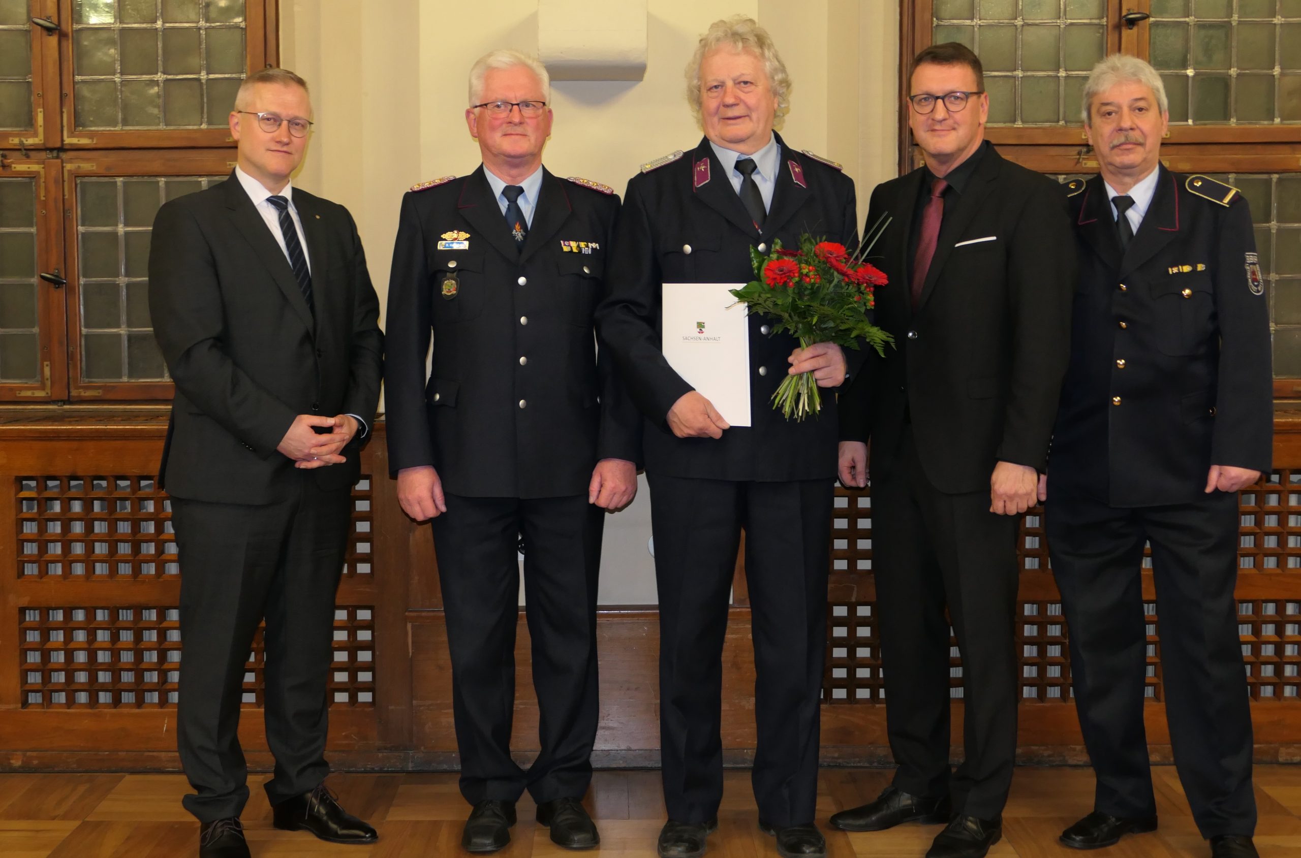 Bild: Gerd Geier, Fachbereichsleiter für Brand- und Katastrophenschutz, Oberbürgermeister Torsten Zugehör, Landesbrandmeister Roland Karthäuser und Bürgermeister André Seidig (v.r.n.l.) ehren Reinhard Rauschning (m.), Ortsbürgermeister von Reinsdorf und langjähriges Mitglied der Freiwilligen Feuerwehr Braunsdorf, mit der Feuerwehrspange des Landes Sachsen-Anhalt. Foto: Stadtverwaltung Wittenberg