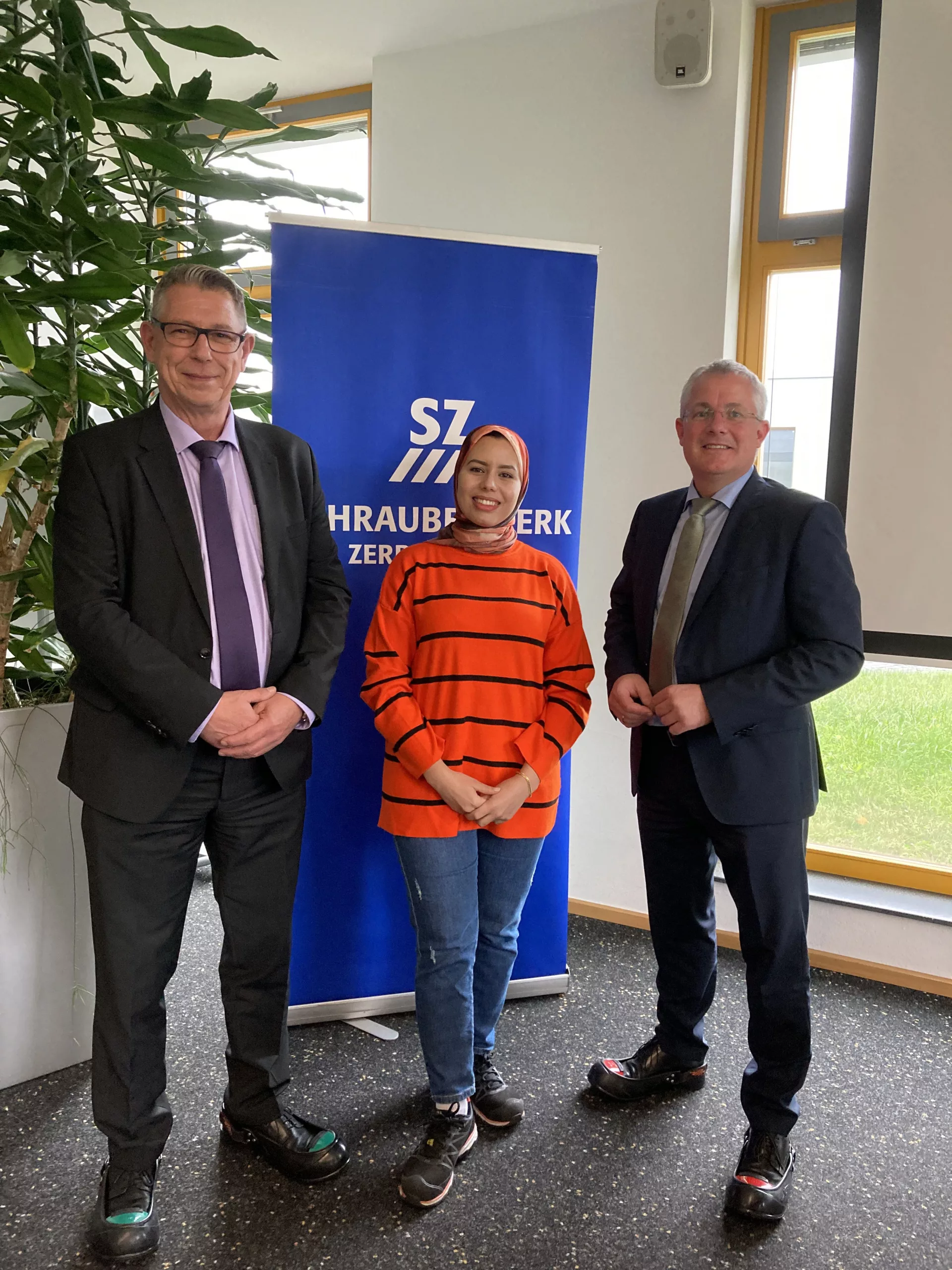 Bild: Olaf Ruch (l.), Chef der Arbeitsagentur Sachsen-Anhalt Ost, Hasna Senhaji, Nachwuchskraft im Schraubenwerk Zerbst GmbH und Markus Behrens, Vorsitzender der Geschäftsführung der Regionaldirektion Sachsen-Anhalt/Thüringen, bei der Präsentation der aktuellen Ausbildungsmarktzahlen in Zerbst. Foto: Arbeitsagentur