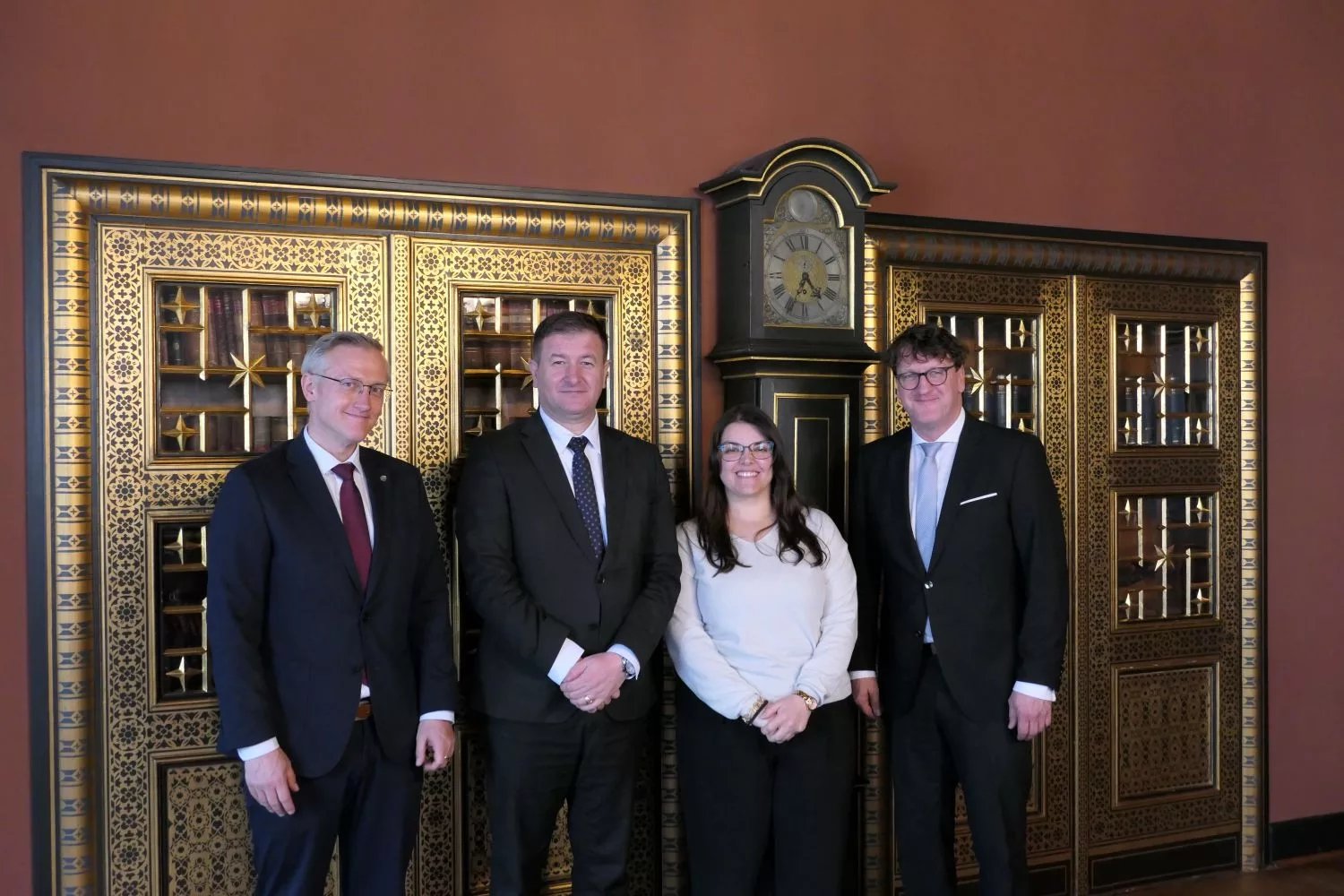 Nach einer herzlichen Begrüßung, bei der auch kleine Gastgeschenke ausgetauscht wurden, fanden sich die Gesprächspartner im historischen Bürgermeisterzimmer zu einem intensiven Austausch zusammen. Im Mittelpunkt standen dabei Möglichkeiten und Perspektiven einer vertieften Zusammenarbeit zwischen der Stadt und der Republik Nordmazedonien, insbesondere im Bildungsbereich.