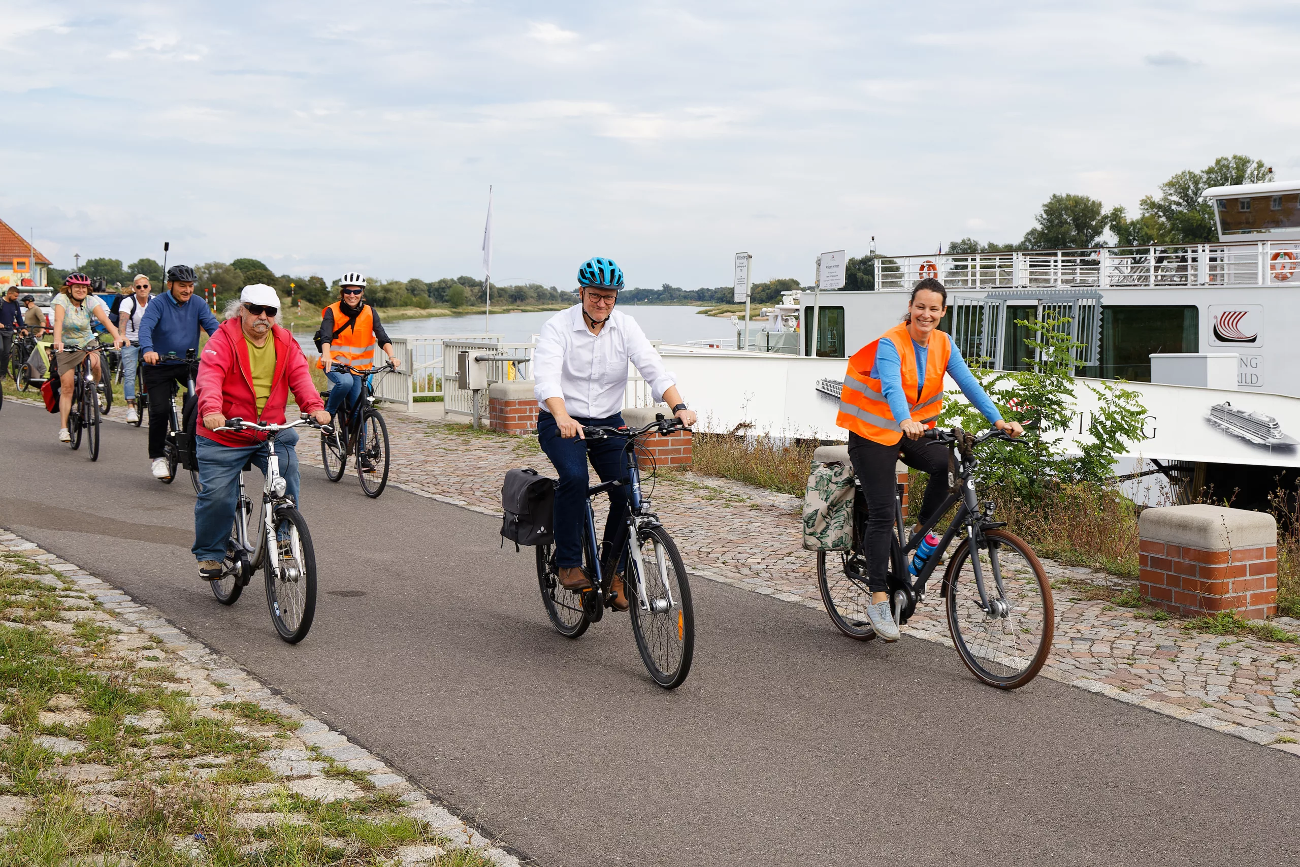 Bild: Bürgermeister André Seidig beim Auftakt von „Stadtradeln“ in Kleinwittenberg, mit im Bild in den Warnwesten Enikö Andersen (Verkehrsplanung, r.) und Jana Hildebrand (Stadtplanung), die die Kampagne organisiert haben. Foto: Stadtverwaltung