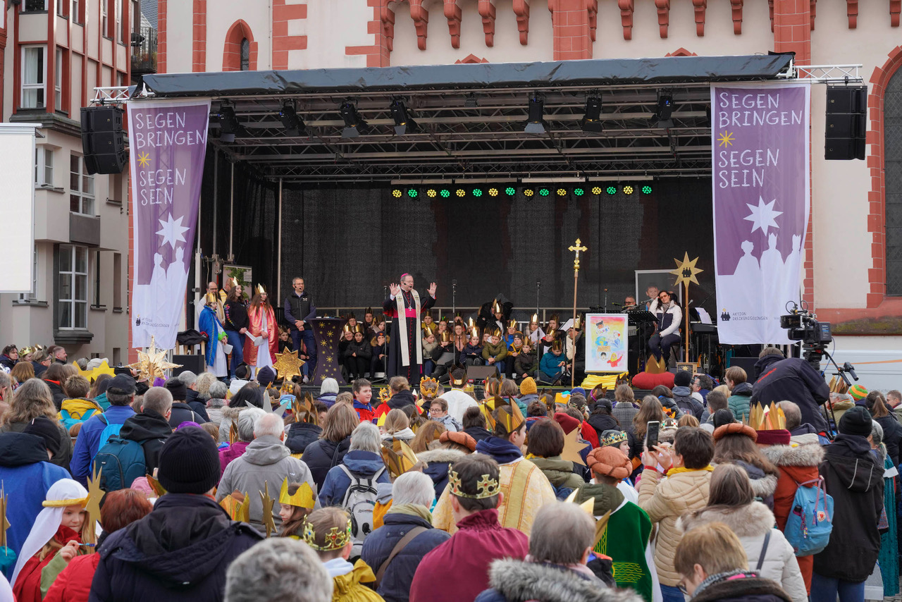 Begleitet von Konfetti und einer La-Ola-Welle eröffneten der Limburger Bischof Dr. Georg Bätzing, Pfarrer Dirk Bingener, Präsident des Kindermissionswerks „Die Sternsinger“ und Domvikar Dr. Stefan Ottersbach, Präses des Bundes der Deutschen katholischen Jugend, die Aktion. „Ich wünsche den Sternsingerinnen und Sternsingern für diese Aktion, dass sie sicher unterwegs sein können“, erklärt Bischof Dr. Bätzing. „Dass sie offene Türen und offene Herzen bei den Menschen finden, bei denen sie anklopfen, und dass sie erfahren: Wir Kinder können etwas tun, wir können etwas bewegen in dieser Welt.“ Während der Eröffnung lobte er mehrfach den Einsatz der Sternsingergruppen in Deutschland.