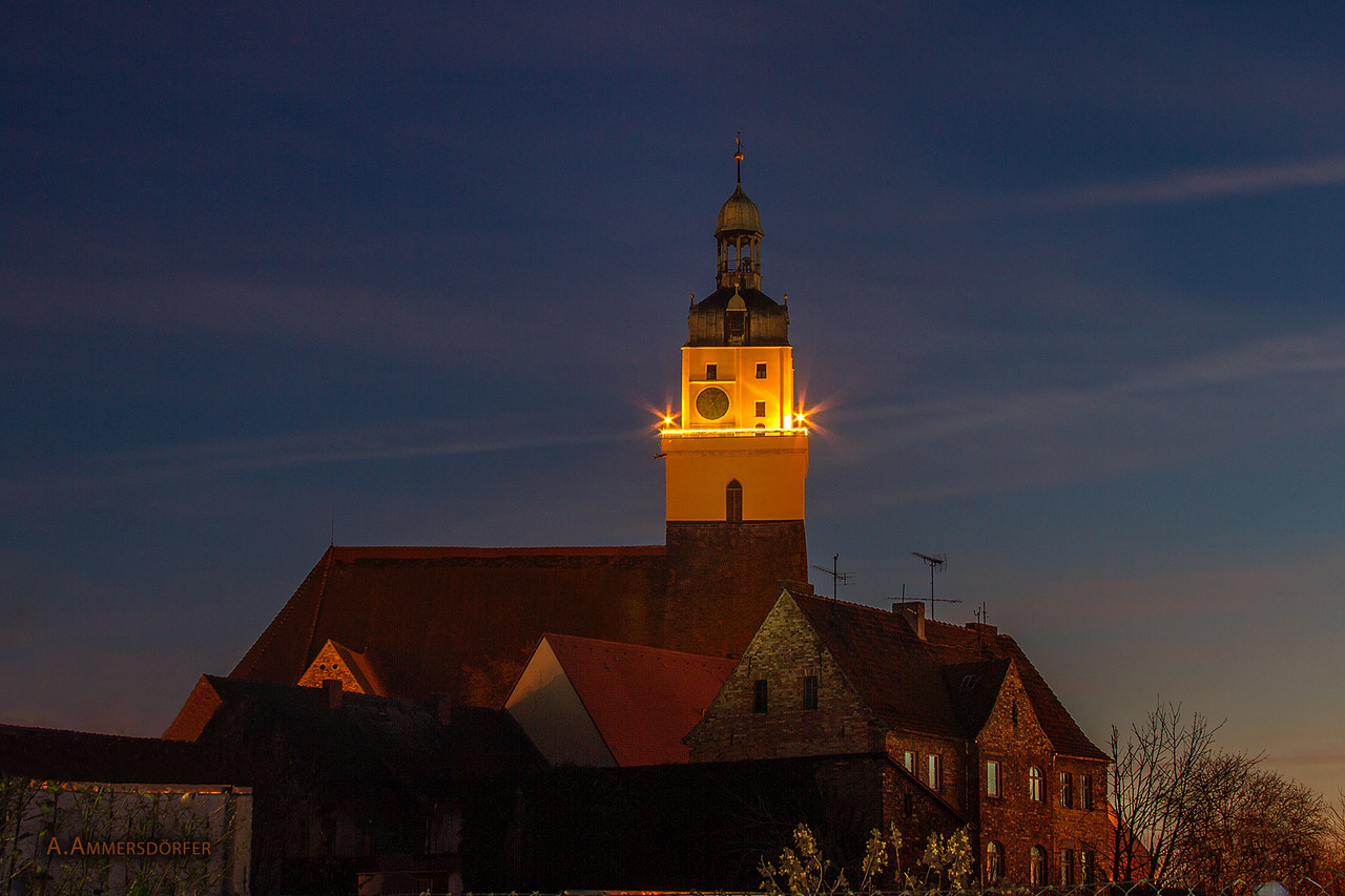 Bild: Der Turm der evangelischen Stadtkirche Bad Schmiedeberg ist mit seine Lichtern der höchste Adventskranz in der Dübener Heide. Foto: Evangelische Kirchengemeinde Bad Schmiedeberg/A. Ammersdörfer