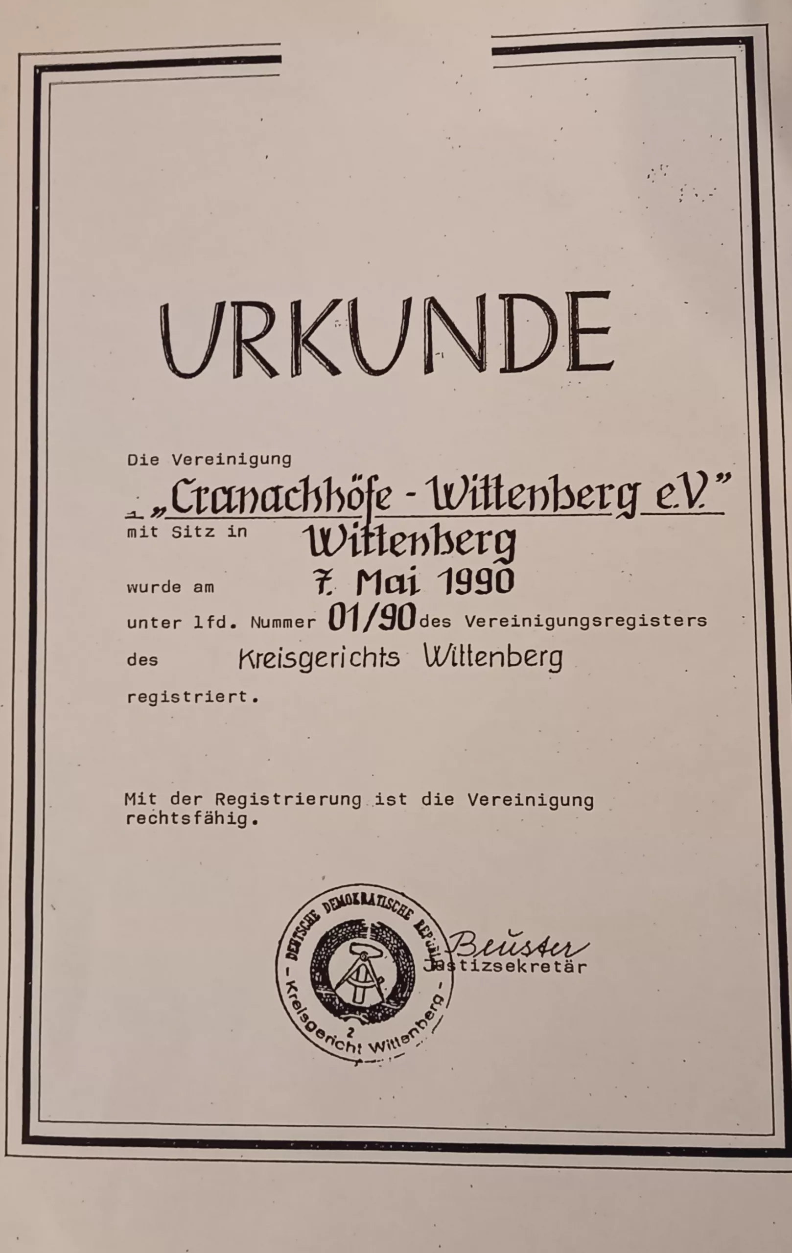 Wittenberg (md/wg). Für die Aktiven ist der 12. Februar 2025 ein denkwürdiger Tag, denn damals wurde vor 35 Jahren der „Cranach-Höfe Wittenberg e.V.“ als erster Verein der Lutherstadt Wittenberg nach der friedlichen Revolution ins Vereinsregister beim Amtsgericht Stendal eingetragen. Am 7. Mai folgte dann die Eintragung unter der Nummer 01/90 beim Kreisgericht Wittenberg. Aus der Bürgerinitiative, die sich im November 1989 mit dem Ziel zur Erhaltung der Cranach Höfe gebildet hat, entstand die Notwendigkeit, einen Verein zu gründen. Die damals formulierten Ziele und Aufgaben stehen auch nach 35 Jahren so in der Satzung des Vereins: Die Förderung von Kultur, Kunst und Denkmalpflege.