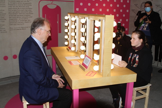 Bild: Auch Ministerpräsident Reiner Haseloff besuchte die Mitmachausstellung „Raus mit der Sprache!“ in Luthers Sterbehaus in Eisleben. Foto: Wolfgang Gorsboth