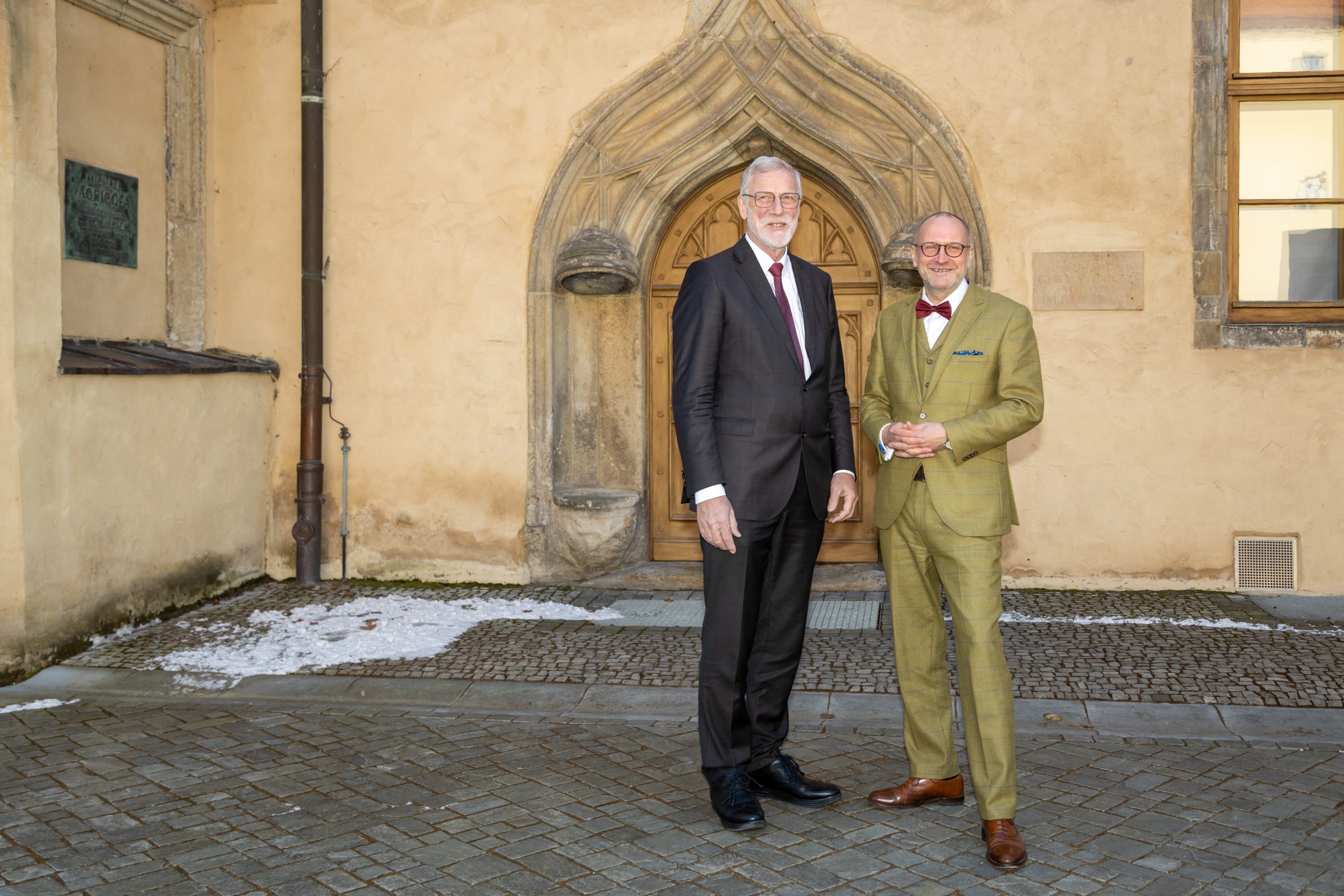 Bild: Dr. Thomas T. Müller (r.) und Rainer Robra vor dem Katharinenportal des Lutherhauses. Foto: ©LutherMuseen/Uwe Schulze