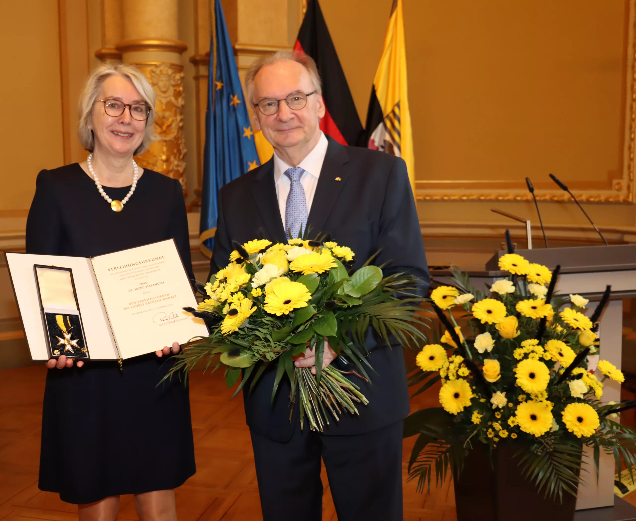 Wittenberg (md/wg). Die Vorsitzende des Freundeskreises der LutherMuseen, Dr. Sigrid Bias-Engels, ist am gestrigen Mittwoch von Ministerpräsident Dr. Reiner Haseloff in der Magdeburger Staatskanzlei mit dem Verdienstorden des Landes Sachsen-Anhalt ausgezeichnet worden. Der Vorstand der Stiftung Luthergedenkstätten in Sachsen-Anhalt, Dr. Thomas T. Müller, sagt dazu: „Mit Frau Dr. Bias-Engels erhält eine überaus engagierte und allseits geschätzte Frau diese höchste Auszeichnung unseres Bundeslandes. Im Namen aller Mitarbeiterinnen und Mitarbeiter unserer Stiftung gratuliere ich der Vorsitzenden unseres Freundeskreises ganz herzlich zu dieser besonderen Ehre!“