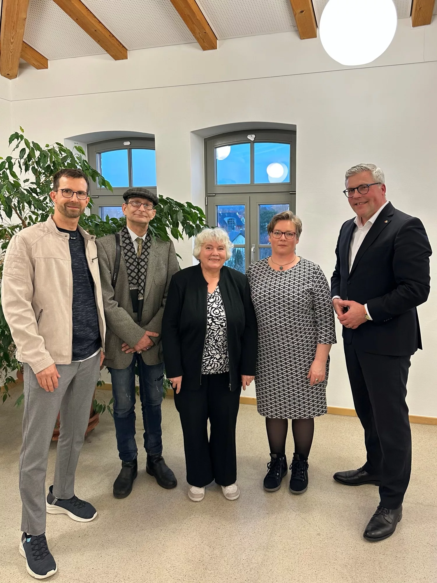 Foto 1: (.v. l.) Olaf Kurzhals (Laudator Sellnau), Fotograf Gabor Sellnau, Textilkünstlerin Monika Kunisch alias Atunja, Melanie Sick (Laudatorin Kunisch) und Andreas Reinhardt, Geschäftsführer Stadtwerke.