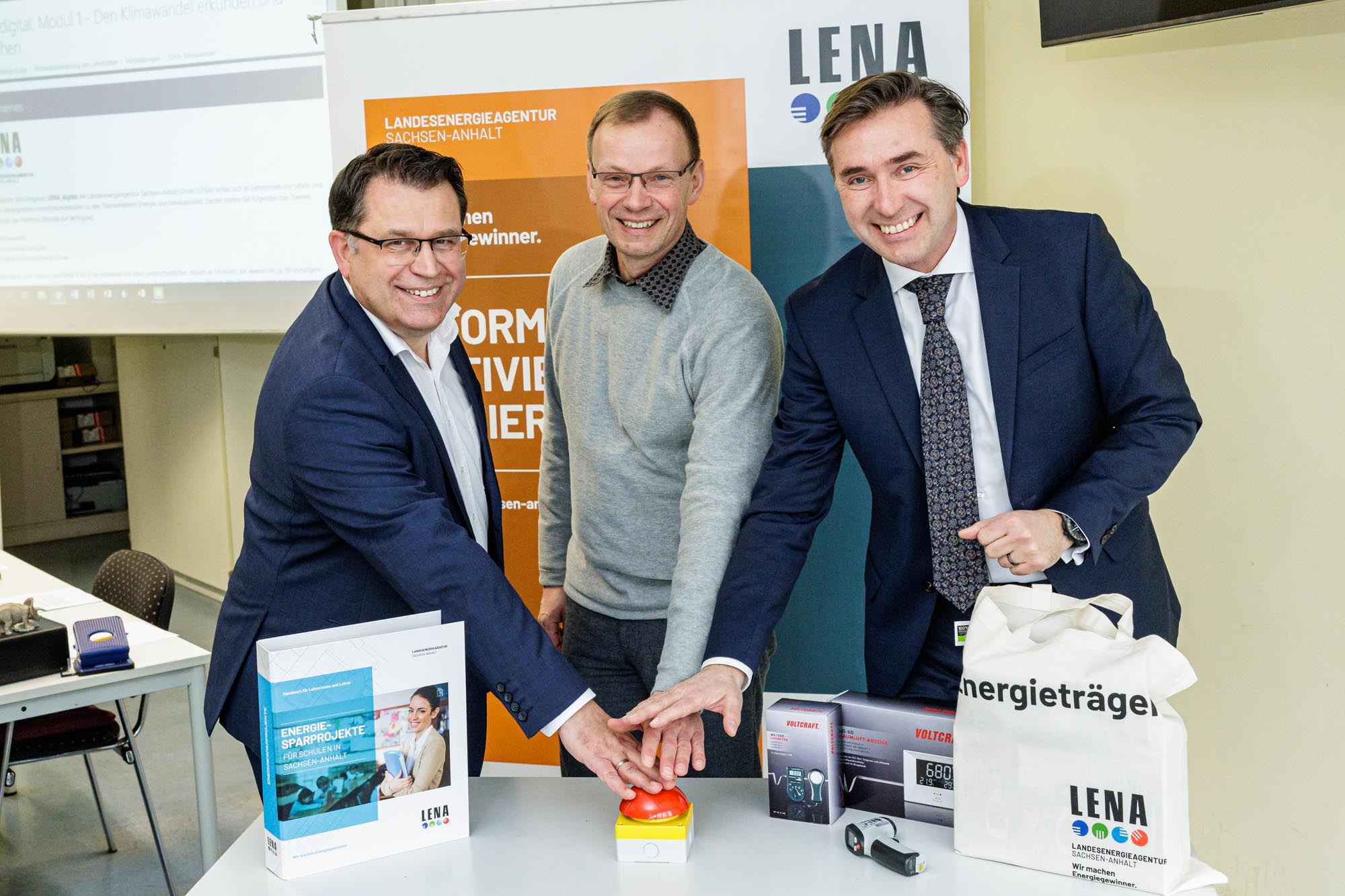 Bild. Staatssekretär Thomas Wünsch, Andreas Slowig, Schulleiter des Christian-Wolff-Gymnasiums in Halle und LENA-Geschäftsführer Marko Mühlstein (v.r.n.l.) schalten symbolisch das neue digitale Bildungsangebot frei, welches ab sofort allen Schulen in Sachsen-Anhalt offen steht.