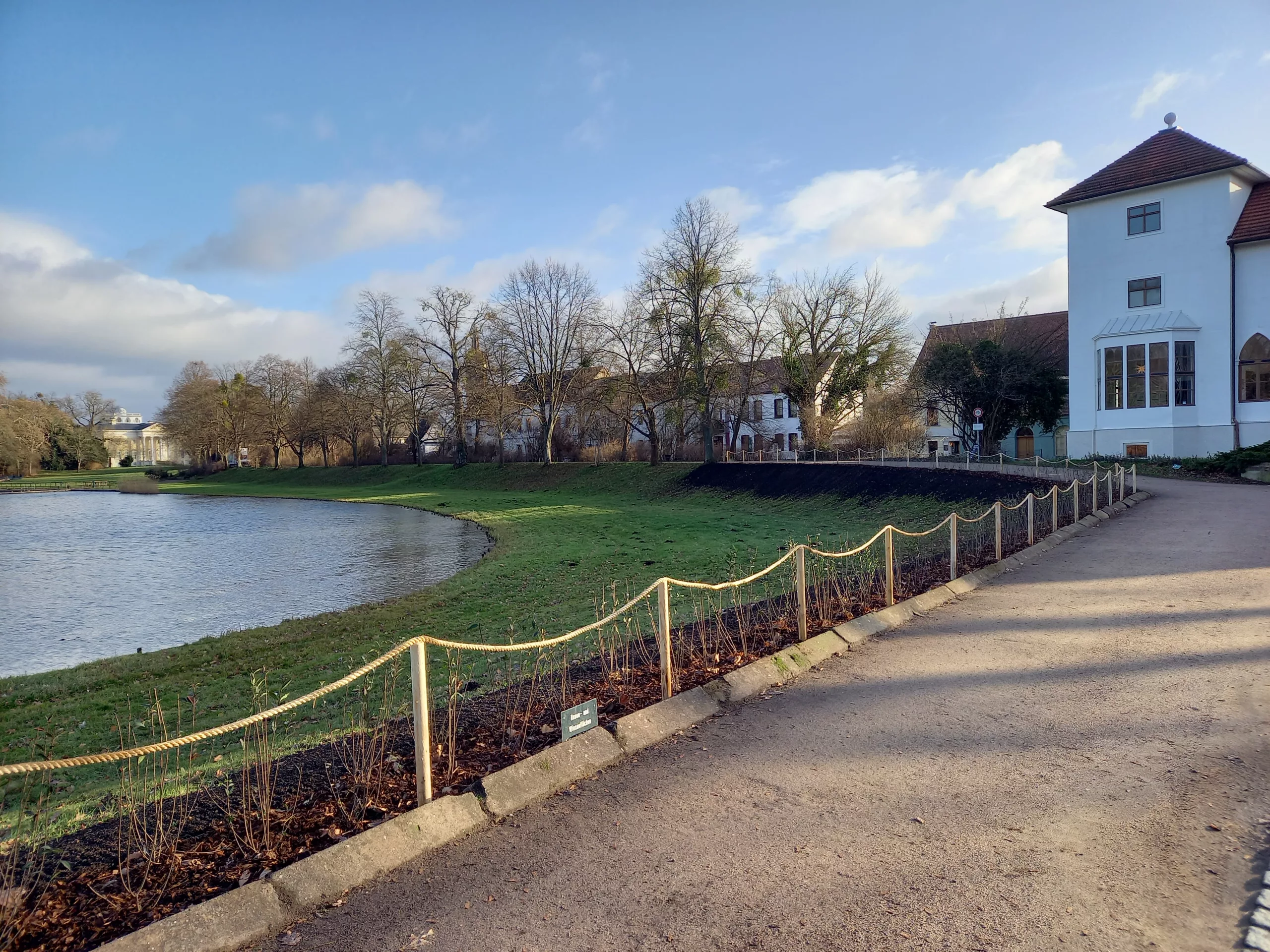 Diese ersetzt die frühere Pflanzung aus rotlaubigen Berberitzen, von denen zuletzt nur noch wenige Exemplare vorhanden waren und wegen der inzwischen erreichten Größe das Gesamtbild zunehmend störten. Die Hecke bildet eine notwendige Abgrenzung zwischen dem Straßenraum und der Uferpartie am Wörlitzer See. Sie wird künftig in Höhe der sich anschließenden Brückenbrüstung geschnitten, so dass der Blick in den Park ungestört bleibt.