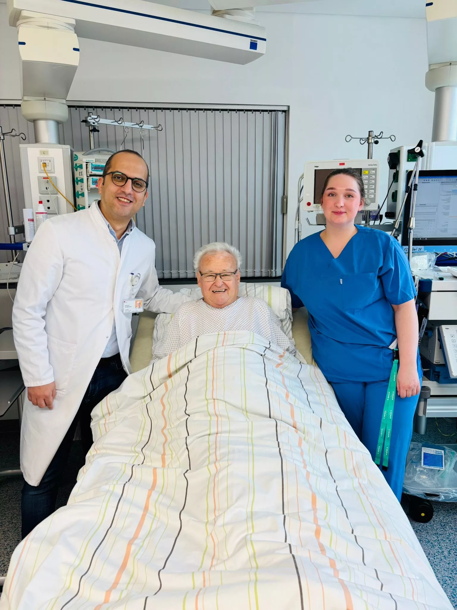 Bild: Chefarzt Kareem El Sherbiny und Jasmin Leiß, Gesundheits- und Krankenpflegerin auf der Intensivstation, mit dem ersten Patienten im Paul Gerhardt Stift, bei dem ein Stent in die Halsschlagader implantiert wurde. Foto: Julia Schilling/PGS