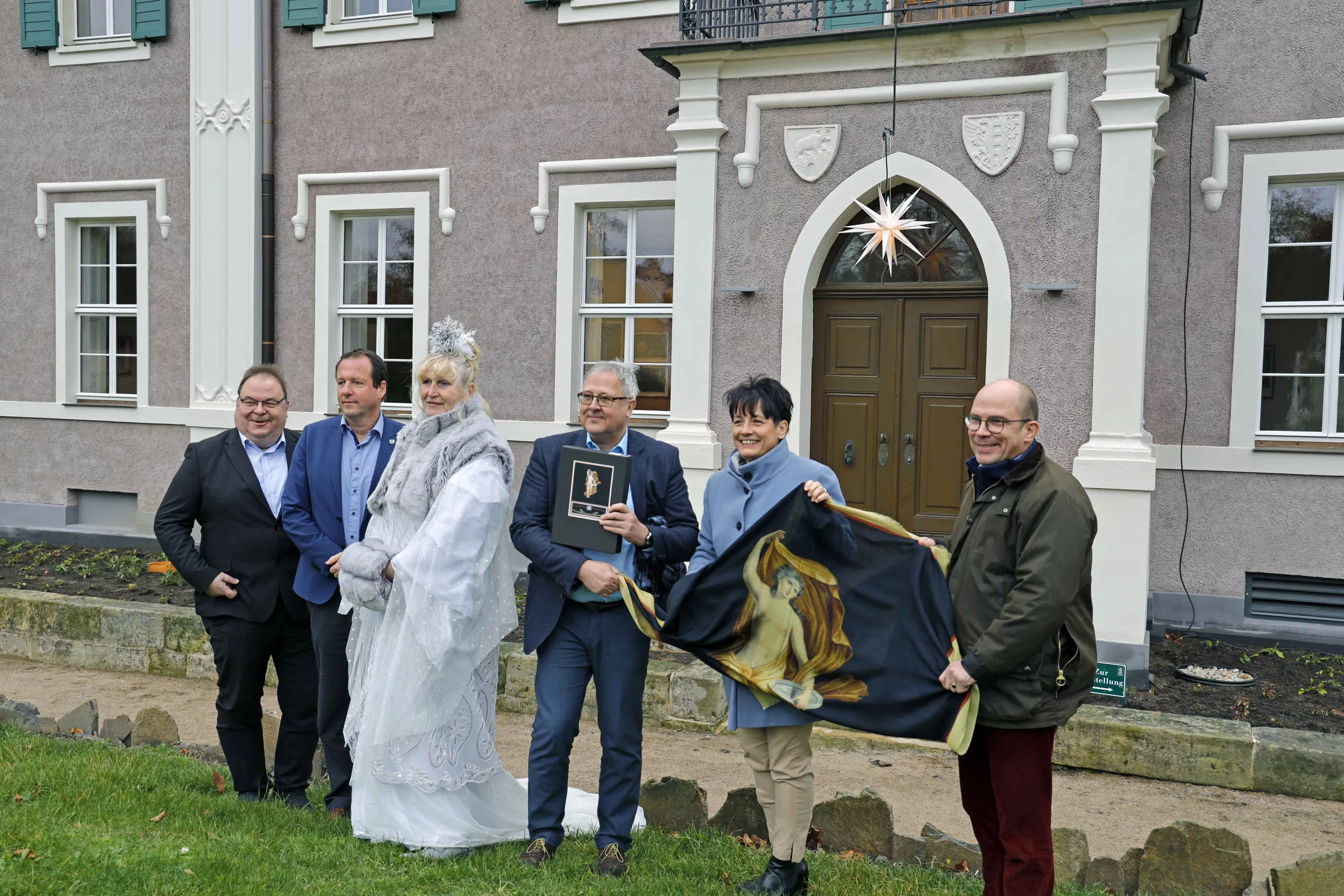 Bild: Michael Pirl, Vorsitzender des Gewerbevereins Wörlitz, Maik Strömer, Bürgermeister Oranienbaum-Wörlitz, die Weihnachtsfee Ines Gerds, Dr. Steffen Kaudelka, Pressesprecher der KsDW, Daniela Borngräber, Geschäftsführerin der Gartenreich-Information und Dr. Rüdiger von Schnurbein (v.l.n.r.), Referatsleiter Museumsmanagement der KsDW. Foto: ©KsDW/Reinhardt
