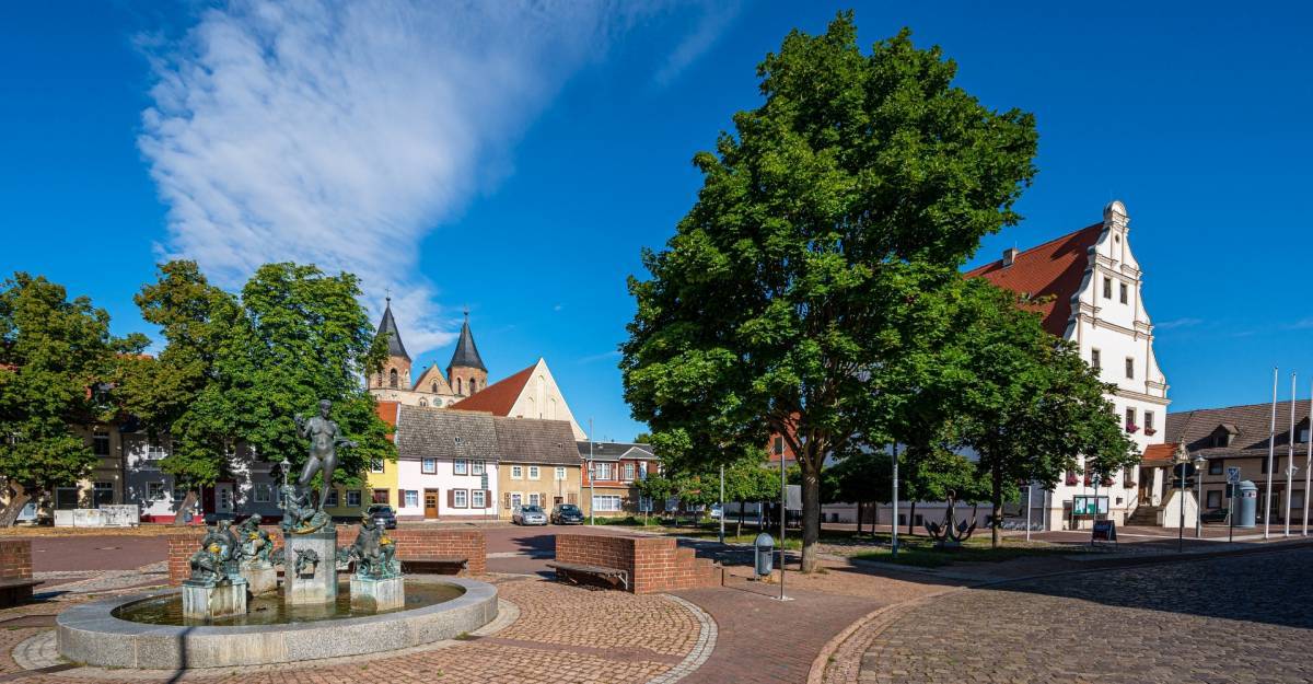 Bild: Akens Marktplatz mit dem Brunnen, rechts im Bild das historische Rathaus, im Hintergrund die Kirche St. Marien. Foto: Uwe Weigel/Verband WelterebeRegion Anhalt-Dessau-Wittenberg