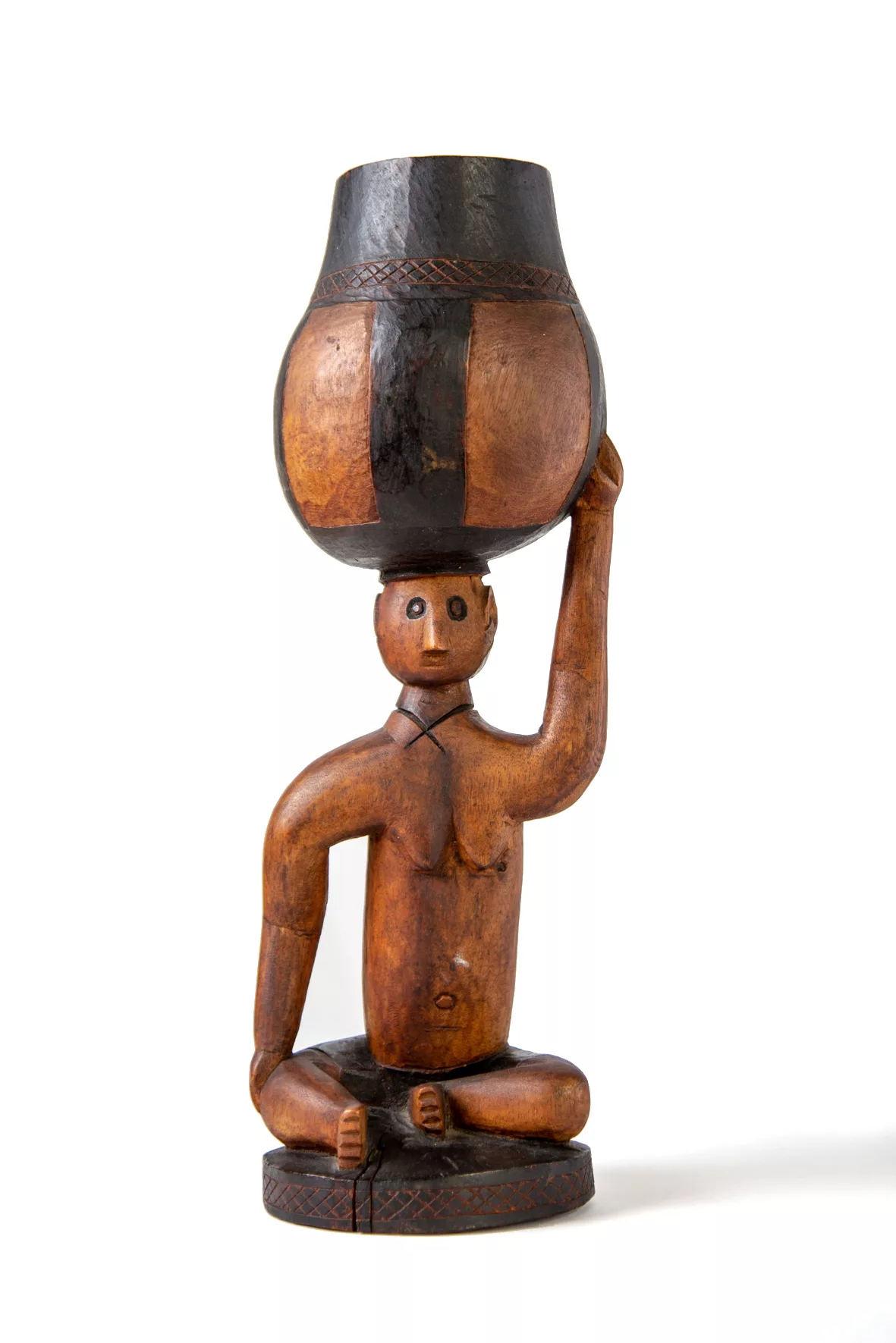 Bild: Sitzende Figur mit Gefäß, ein Werk des mosambikanischen Bildhauers Muhlati, Ende 19., Anfang 20. Jahrhundert. Foto: Ana M. Valdivia