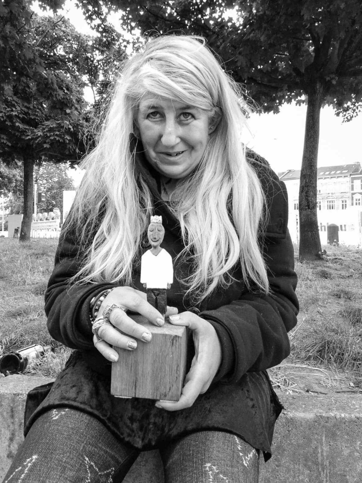 Die porträtierten Frauen halten zudem alle eine Holzkönigin in ihren Händen, die vom Künstler Ralf Knoblauch geschnitzt wurde. Seine Königinnenfiguren wollen Antworten auf die Fragen geben, wie viel Würde jedem Menschen zukommt und wie viel davon im Verborgenen bleibt.