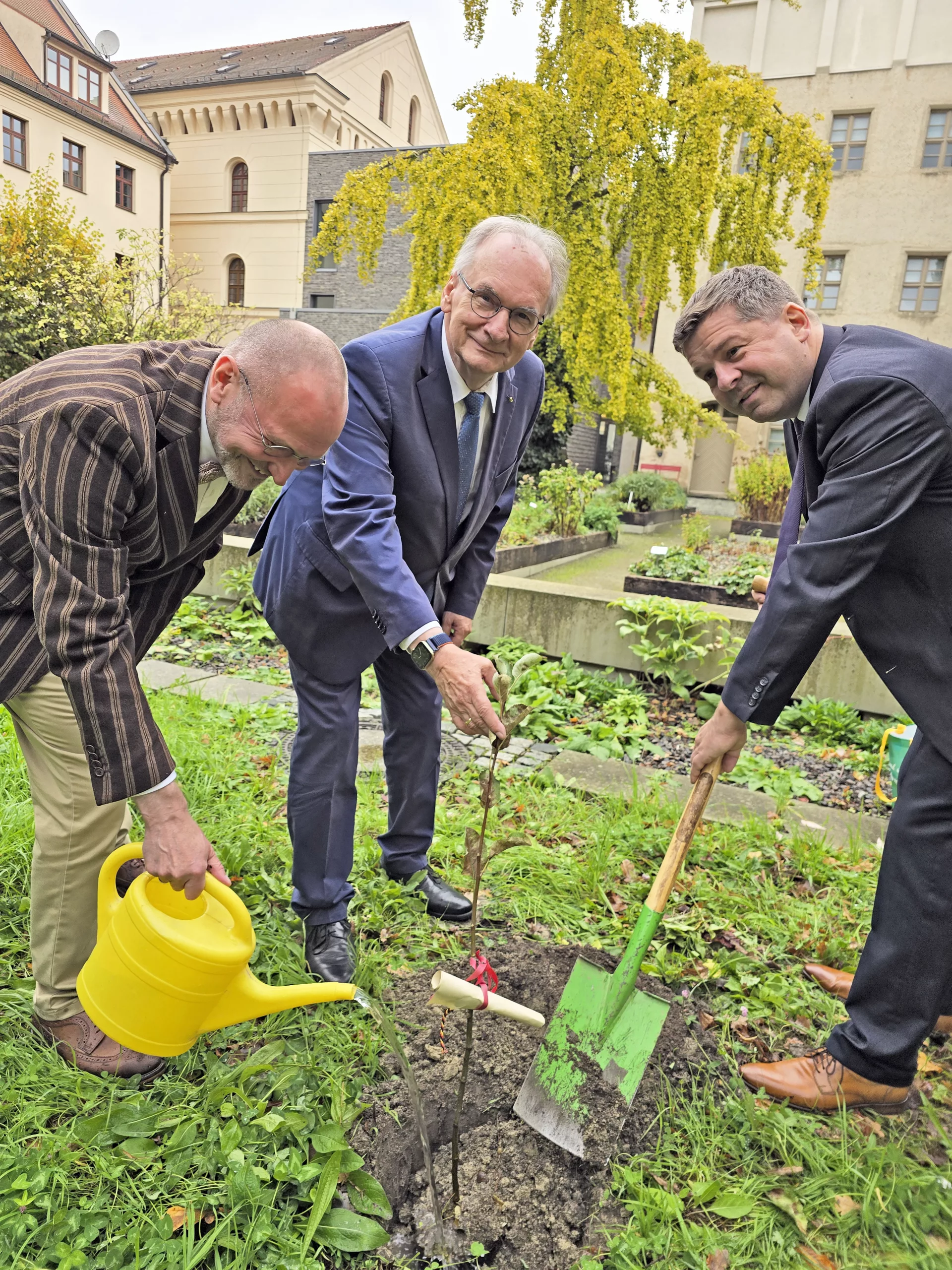 Wittenberg (md/wg). Zur Erinnerung an den vor 500 Jahren hingerichteten Reformator Thomas Müntzer haben Sachsen-Anhalts Ministerpräsident Dr. Reiner Haseloff, Wirtschaftsminister Sven Schulze und der Vorstand der Stiftung Luthergedenkstätten in Sachsen-Anhalt, Dr. Thomas T. Müller, im Wittenberger Melanchthongarten einen Apfelbaum gepflanzt. Es handelt sich dabei um den „Frankenhäuser Müntzer-Apfel“, eine historische Apfelsorte, die seit 2019 beim Bundessortenamt registriert ist.