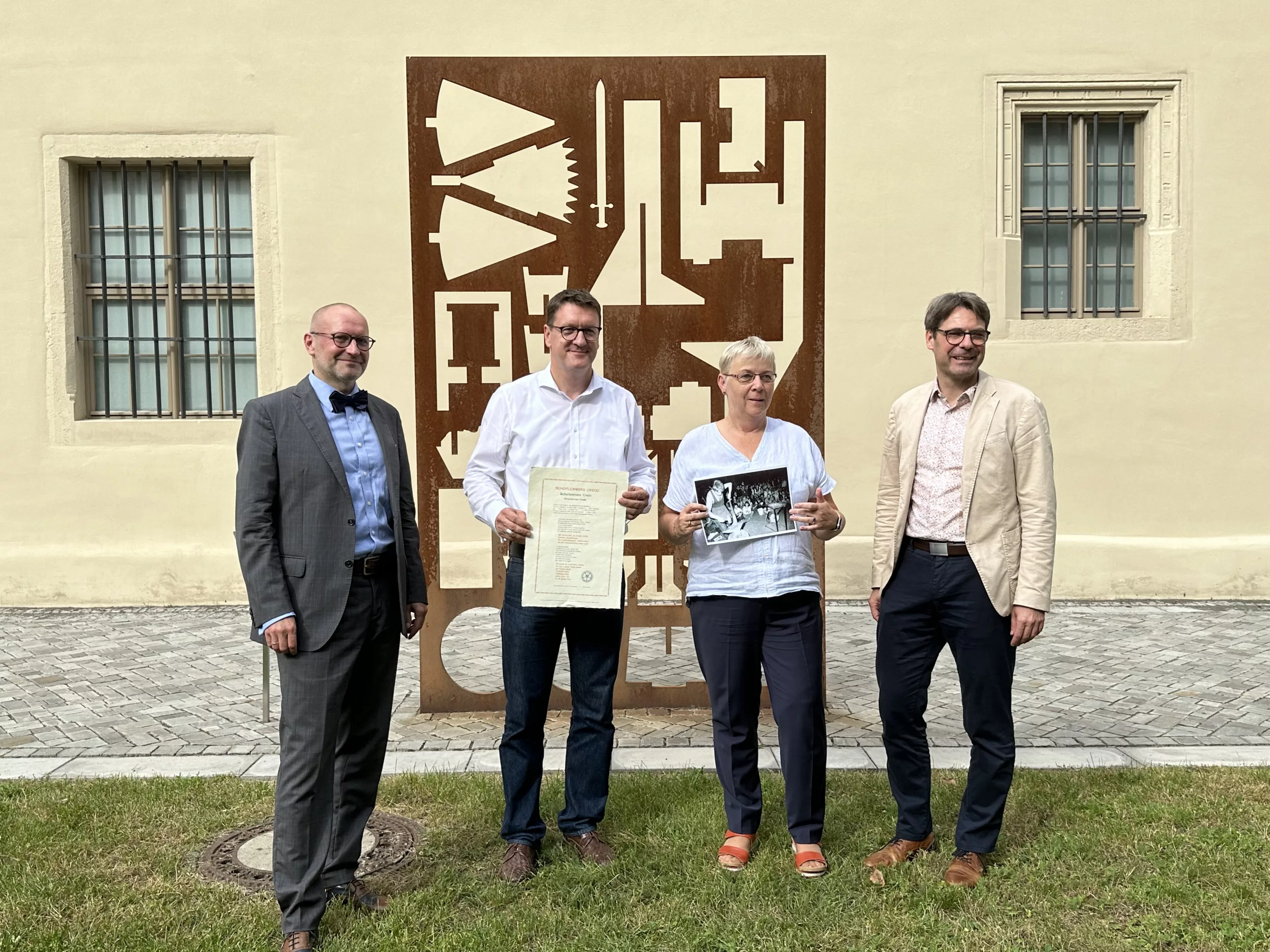 Bild: Dr. Thomas T. Müller, Direktor der LutherMuseen, Oberbürgermeister Torsten Zugehör, Zeitzeugin Elke Witt und Christoph Maier, Direktor der Evangelischen Akademie Sachsen-Anhalt (v.l.n.r.) vor dem Denkmal „Schwerter zu Pflugscharen“ auf dem Lutherhof. Foto: Stiftung LutherMuseen