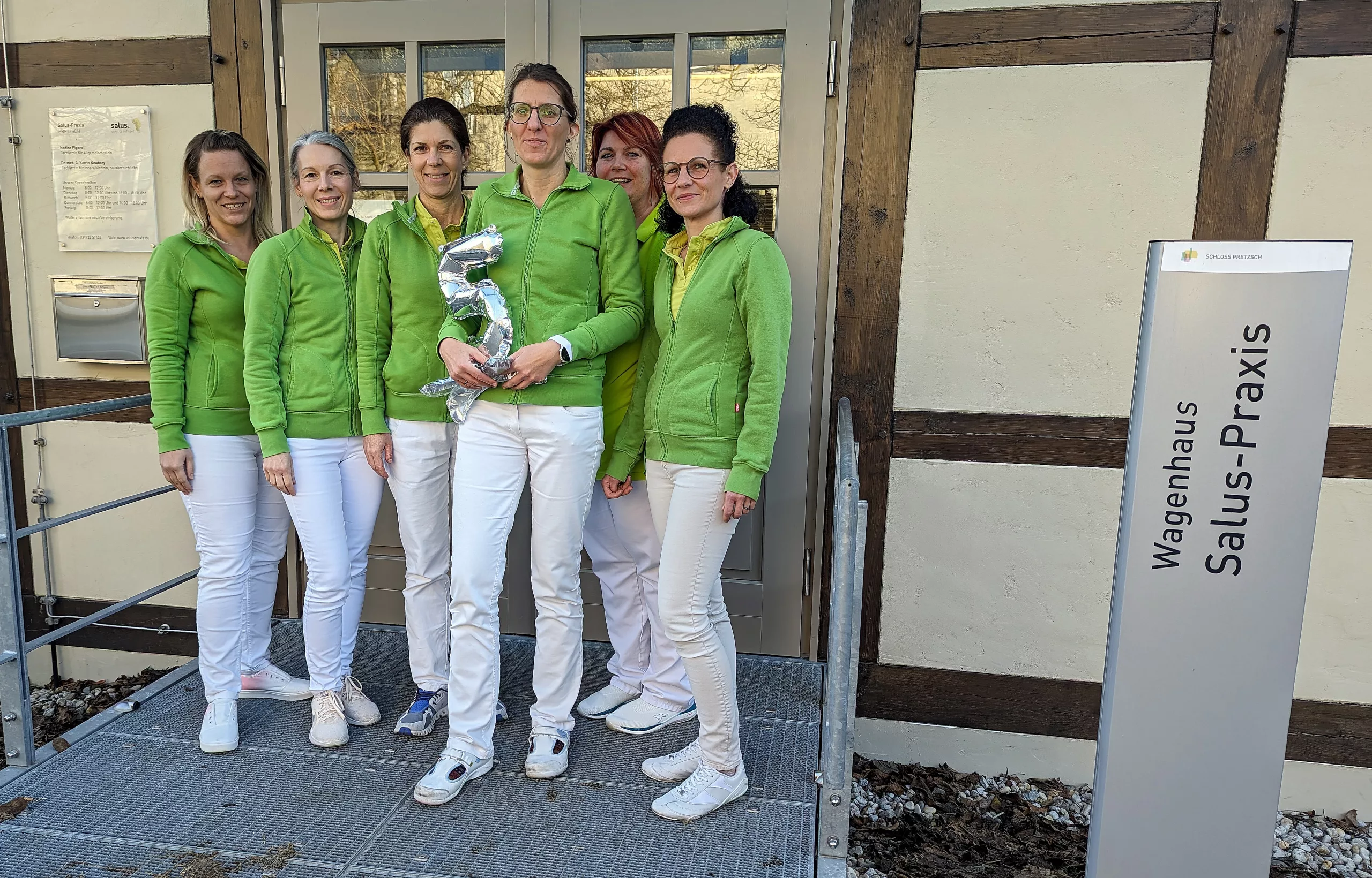 Bild: Die Fachärztinnen Dr. Ceylan Katrin Nowbary und Nadine Pigors (3. und 4. von links) tragen mit ihrem Team zur verlässlichen hausärztlichen Versorgung in Pretzsch und Umgebung bei. Foto Salus