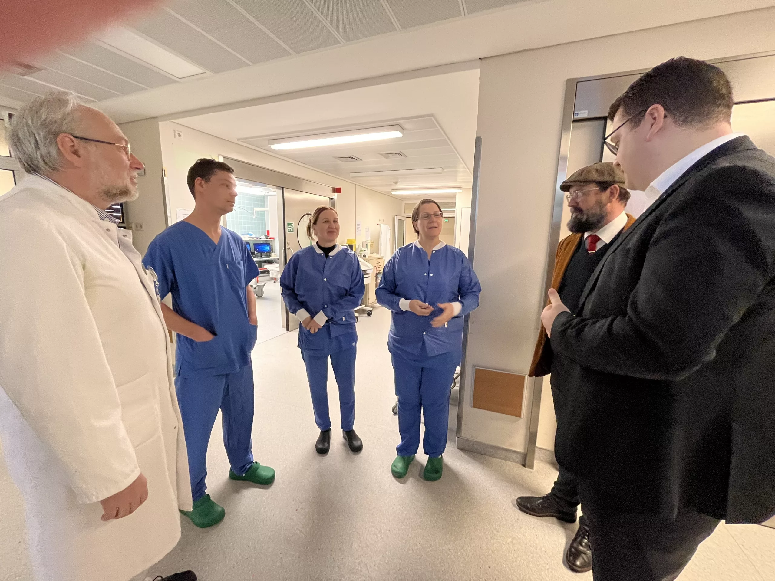 Die nächste Station ist die Notaufnahme des Paul-Gerhardt-Stifts. Chefarzt Prof. Dr. med. Peter Michael Jehle und sein OP-Team begrüßen Tylsch. Die Notaufnahme ist an diesem Vormittag bereits gut gefüllt, doch für das OP-Team gab es noch keinen Einsatz. Bevor es auf die Wöchnerinnenstation geht, noch ein kurzer Stopp in der Geriatrie. Ein Notfall. Einem Patienten, der sich gerade einer Endoskopie unterzieht, muss ein Gallenstein entfernt werden.