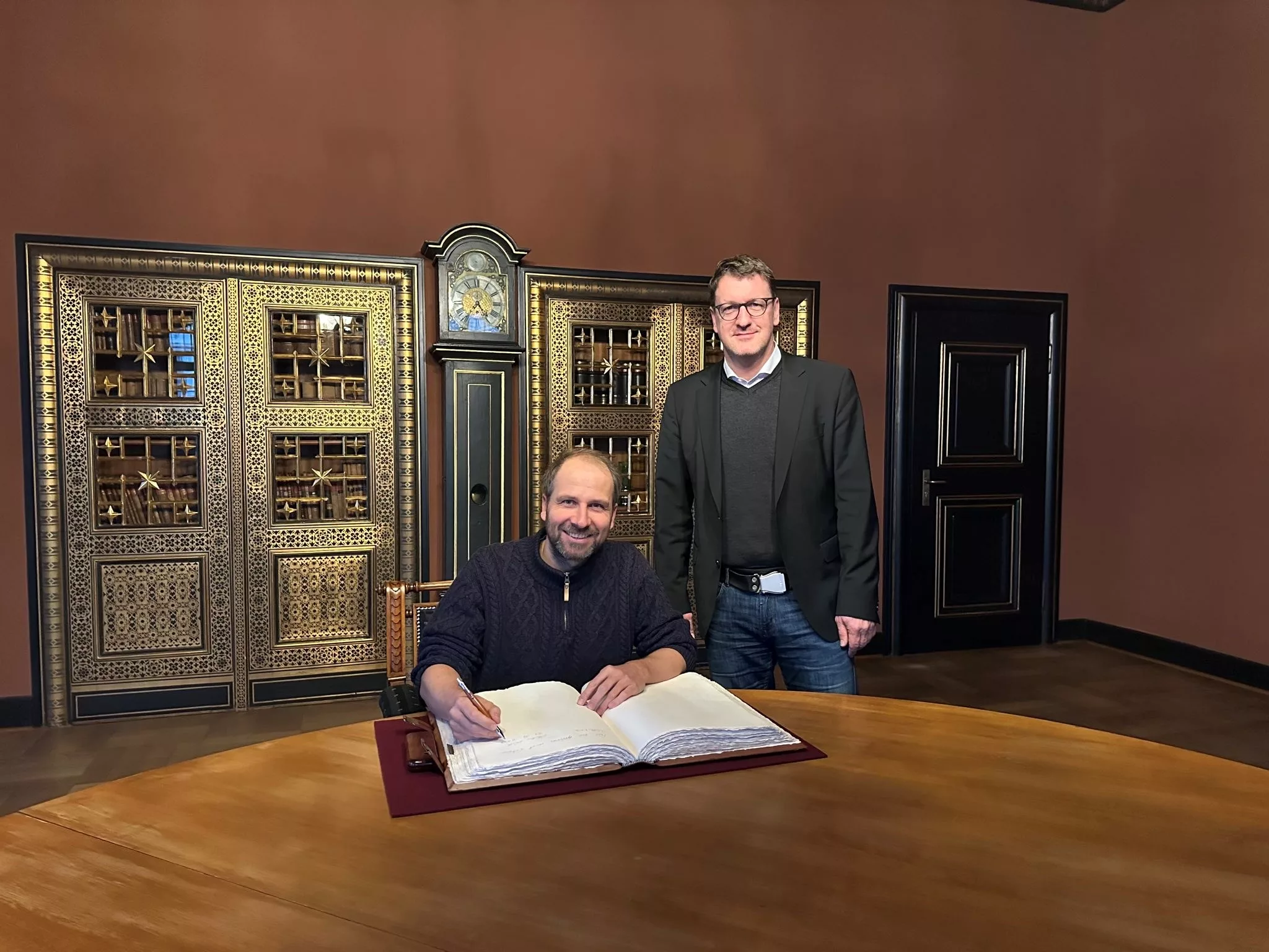 Bild: Christian Kroll trägt sich im Beisein von Oberbürgermeister Torsten Zugehör ins Goldene Buch der Stadt ein. Foto: Stadtverwaltung
