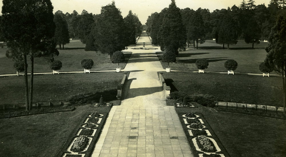 Bild: Blick vom Schloss Oranienbaum in den Garten mit seinen barockisierenden Rabatten. Foto: Hallervorden 1930, © KsDW Bildarchiv