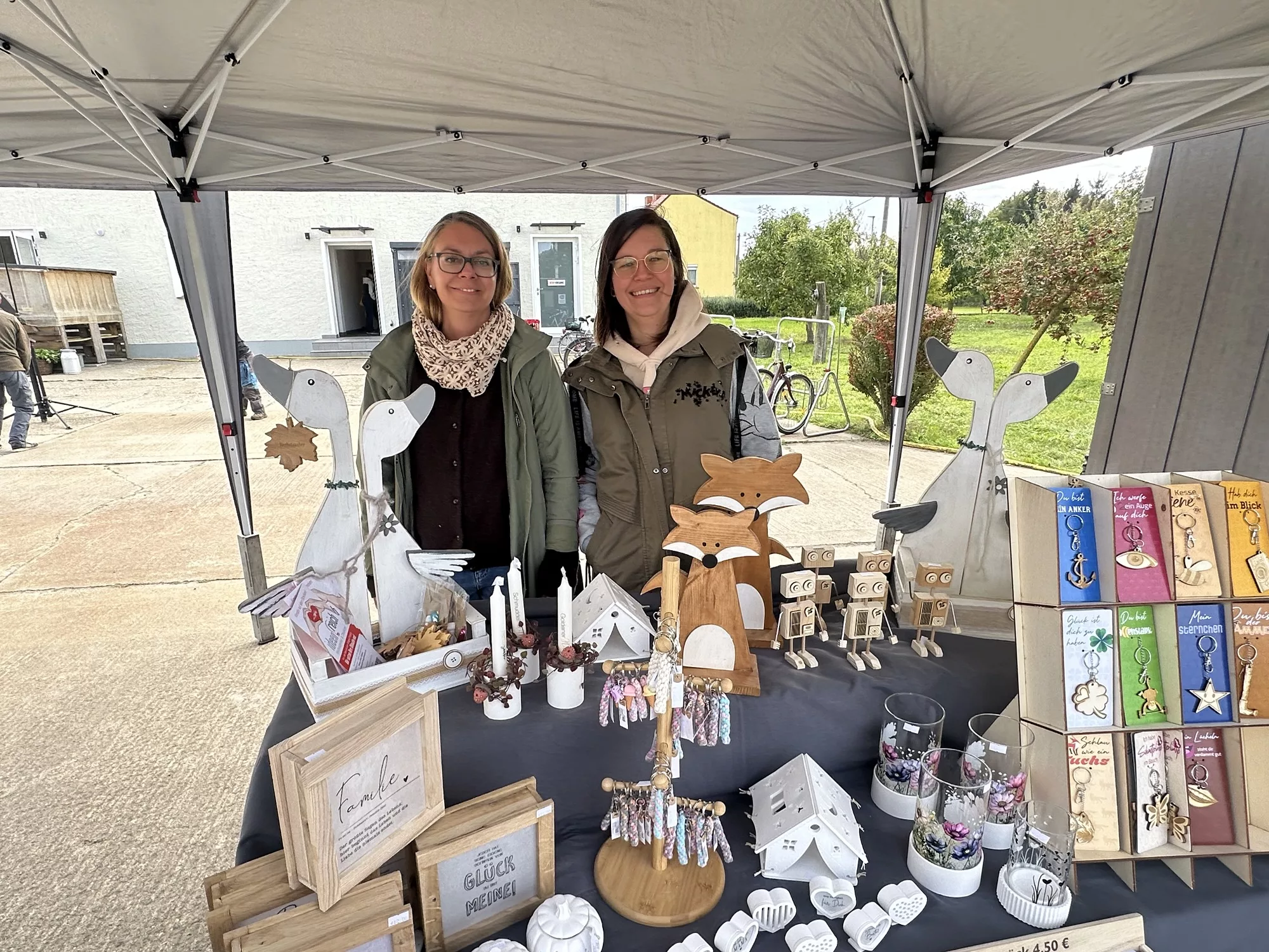 Am Stand des Ideenreichs präsentierte Babett Fitz kreative Werkstücke, die im Ideenreich im Nußbaumweg hergestellt werden – dort entsteht auch das Magazin Mittendrin. Die Besucher nutzten die Gelegenheit, die Geschenkartikel direkt vor Ort zu erwerben. Auch der Direktverkauf mit frischen Eiern, Gemüse und weiteren Hofprodukten wurde rege genutzt.