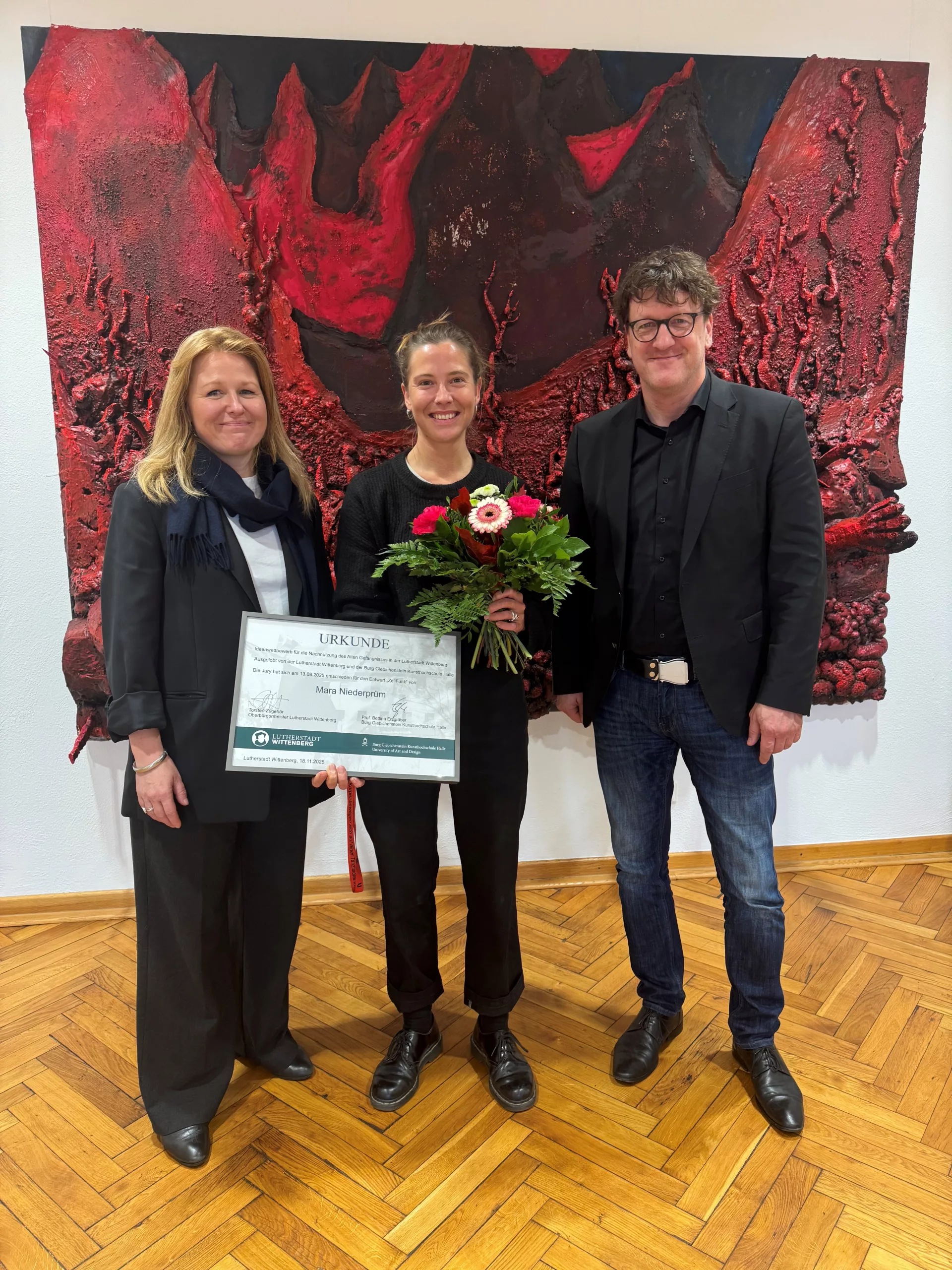 Im Rahmen der Ehrung besprachen Oberbürgermeister Torsten Zugehör, Sandra Wilking, Geschäftsführerin der Lutherstadt Wittenberg Marketing GmbH und Gewinnerin Mara Niederprüm das weitere Vorgehen sowie die Umsetzung des Siegerkonzeptes. Aktuell arbeitet die Lutherstadt Wittenberg gemeinsam mit verschiedenen Akteuren an einer ganzheitlichen Entwicklungsstrategie für das Alte Gefängnis. Das Konzept „ZellFunk“ soll bei dieser Strategie nun eine zentrale Rolle einnehmen.