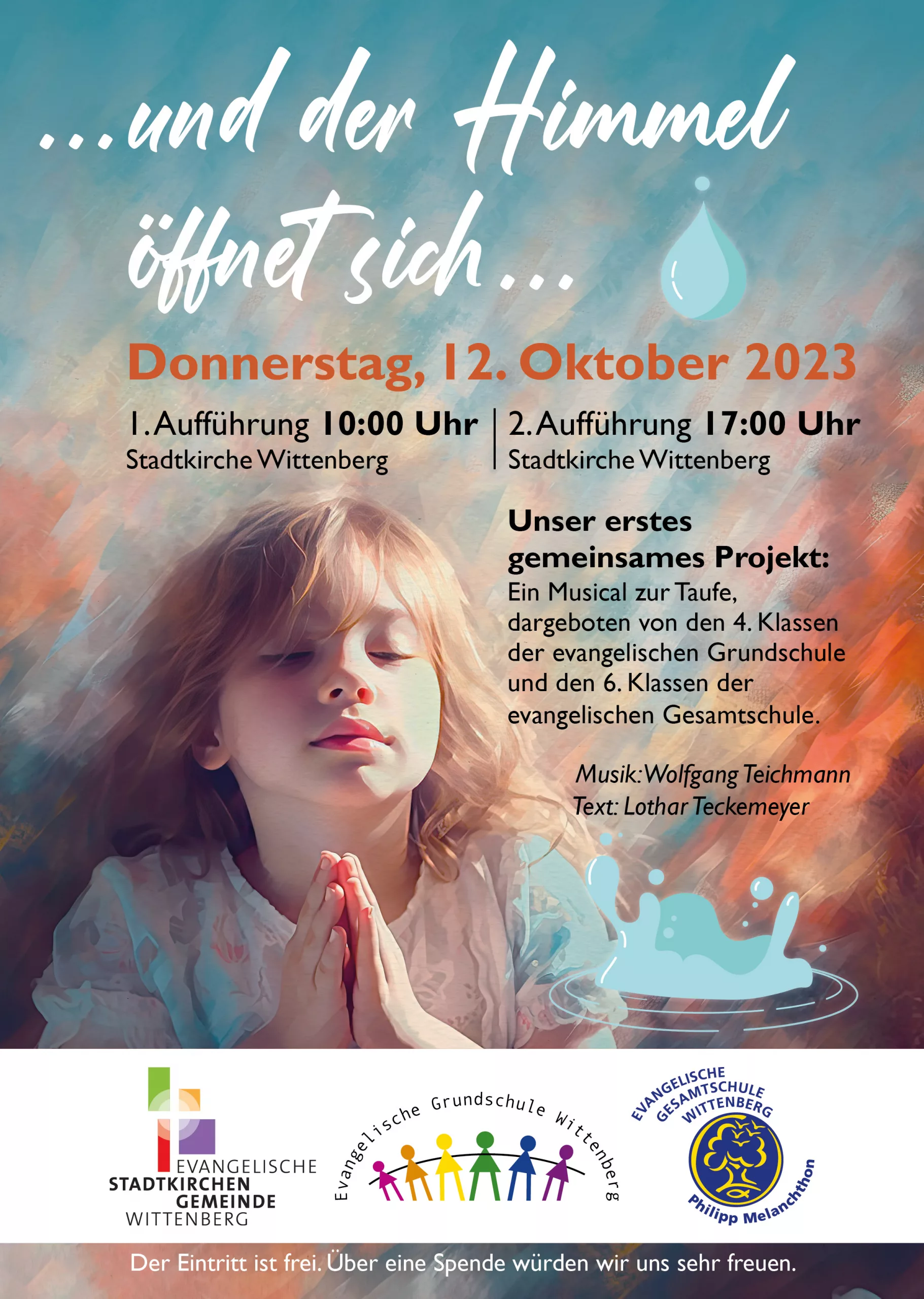 Wittenberg (md). Am Donnerstag, dem 12. Oktober 2023, werden unter der Leitung von Stadtkirchenkantor Christoph Hagemann fast 100 Kinder gemeinsam auf der Bühne stehen: Die beiden vierten Klassen der Evangelischen Grundschule und die beiden sechsten Klassen der Evangelischen Gesamtschule „Philipp Melanchthon“. Die Schülerinnen und Schüler haben bereits vor den Sommerferien mit den Proben am Musical „…und der Himmel öffnete sich“ begonnen. Die Musik stammt von Wolfgang Teichmann, der Text von Lothar Teckemeyer.