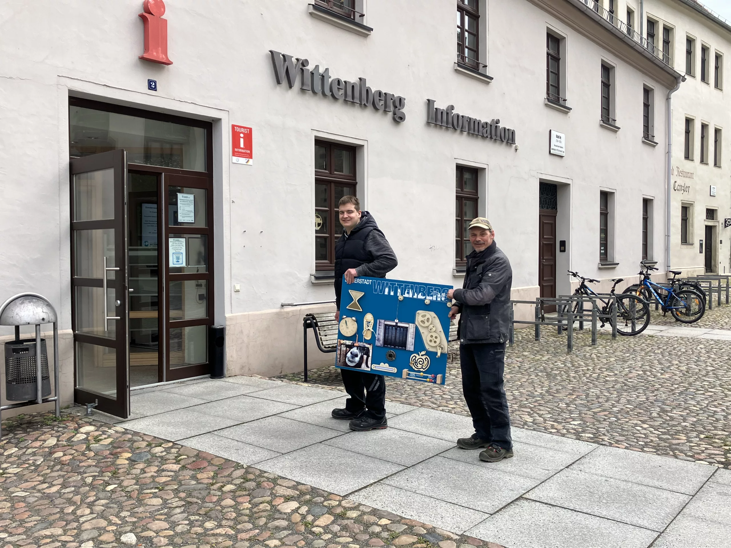 Mit der WBG, die in diesem Jahr 70 Jahre feiert und 70 gute Taten vollbringen möchte, wurde der Geldgeber gefunden. Das Unikat wurde dann im Holzbereich des Ideenreiches im Nussbaumweg von Beschäftigten der Werkstatt gefertigt und am 10. April nicht nur übergeben, sondern auch gleich am Tresen der Touri-Information angebracht.