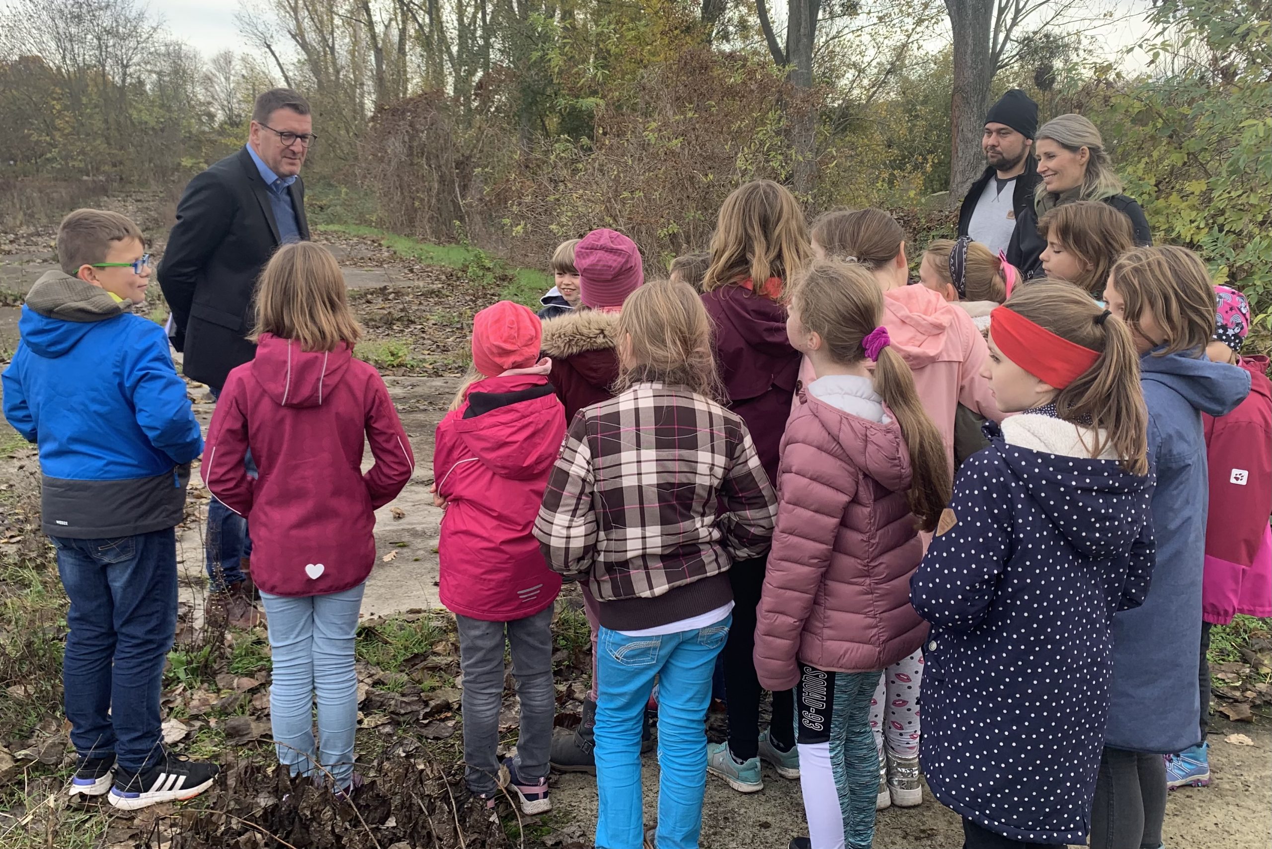 Bild: Oberbürgermeister Torsten Zugehör bedankte sich bei den Kindern der Grundschule Diesterweg für ihre kreativen Ideen zur Entwicklung der Kuhlache als zentraler Bestandteil der Laga 2027. Foto: Stadtverwaltung