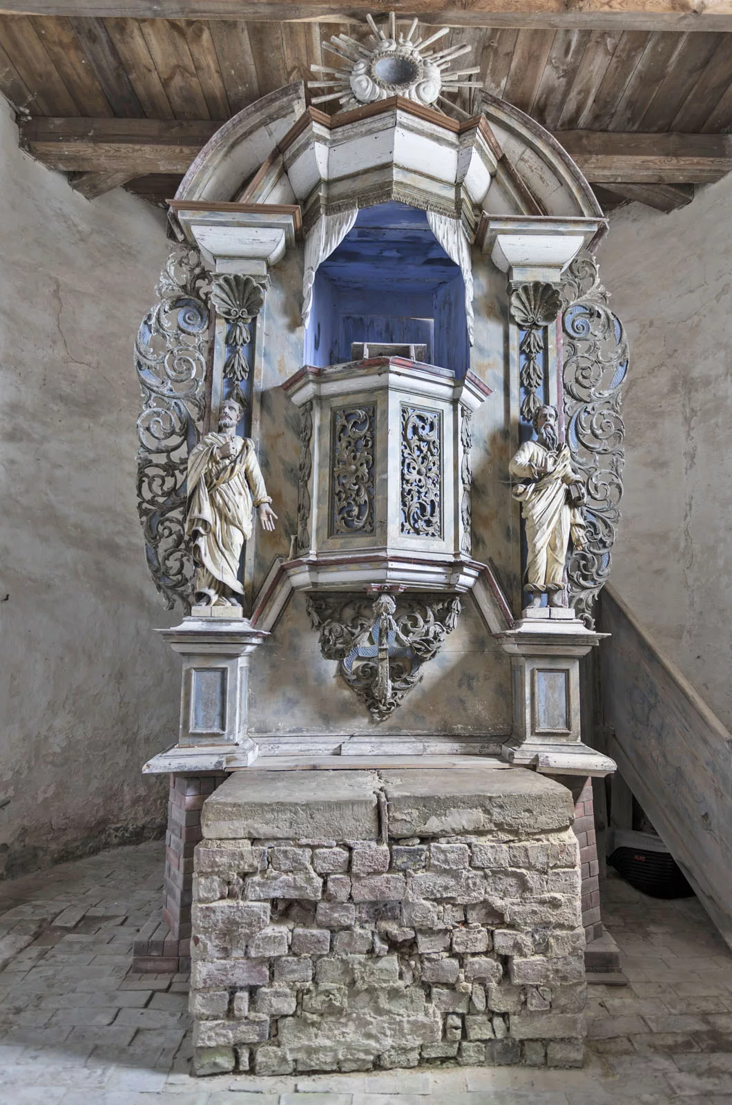 Der Kanzelaltar bestimmt in der originalen Farbfassung aus Blau, Weiß und mattem Gold bis heute den flachgedeckten Innenraum mit seiner Westempore. Der Kanzelkorb wird flankiert von vollplastischen Figuren der Heiligen Petrus und Paulus. Die Kostbarkeit ist ein Relikt aus der untergegangenen Zeit der fürstlichen Zerbster Barockkunst. Das Inventar mit Patronatsempore im Westen, Gestühl und Predigerstuhl ist noch in Gänze erhalten. 1717 wurde der Bau durch einen prägnanten Dachreiter erweitert, der leider im Zweiten Weltkrieg Bomben zum Opfer fiel. Die uralte Dorfkirche war als Ausguck gegen Tiefflieger zum Schutz des Fliegerhorstes genutzt worden. Foto: Matthias Behne