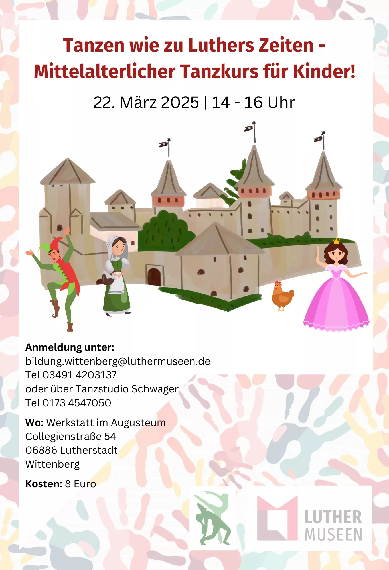 Der Workshop steht unter dem Motto „Tanzen wie zu Luthers Zeiten“ und entführt die teilnehmenden Mädchen und Jungen im Alter zwischen 6 und 12 Jahren in die Welt der Burgfräulein und Edelmänner des 16. Jahrhunderts. Es wird sowohl in Gruppen als auch in Paaren getanzt – tänzerische Vorerfahrung ist nicht erforderlich.
