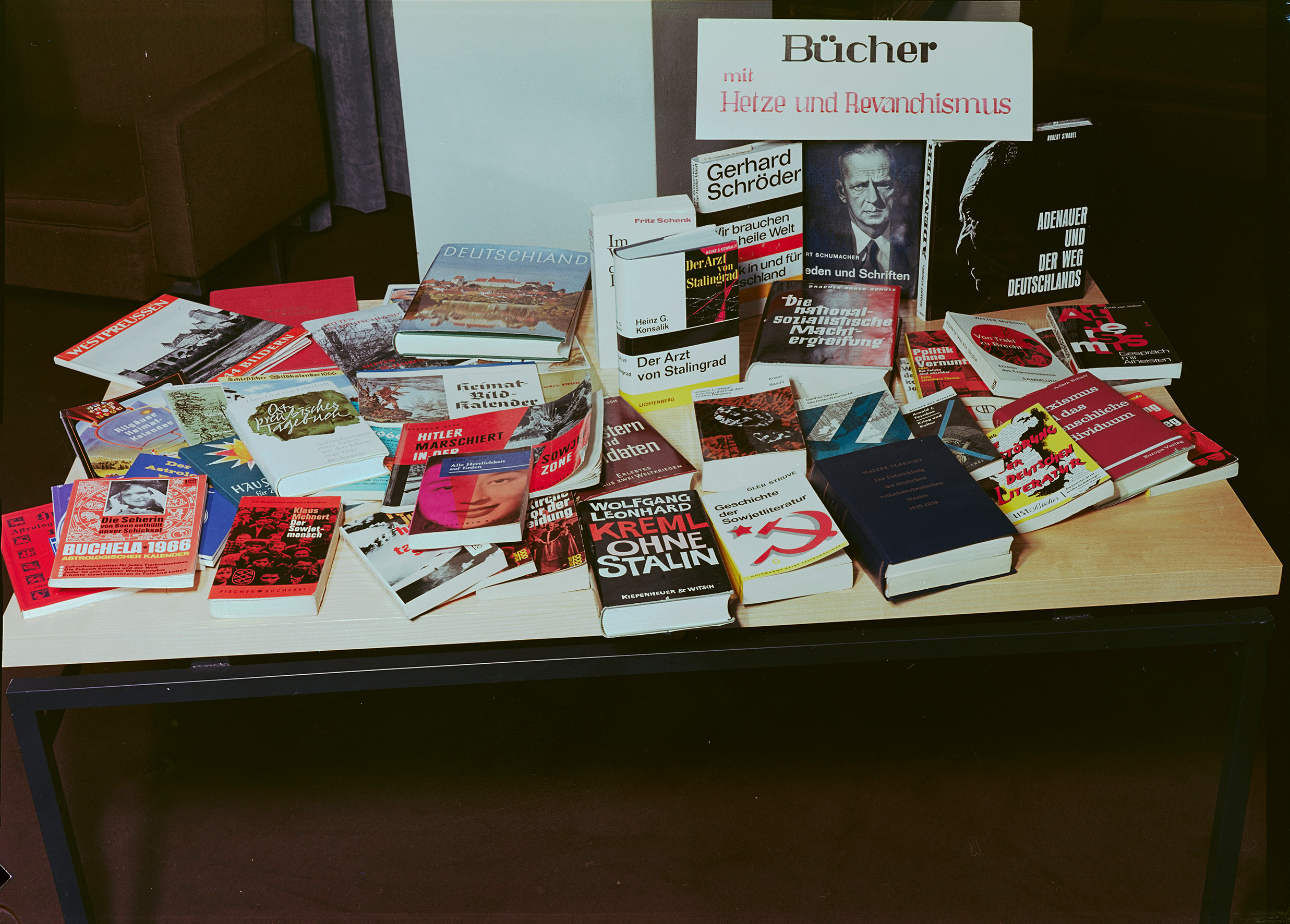 George Orwells „1984“ konnte nur lesen, wer einen „Giftschein“ besaß, denn das 1949 geschriebene Buch über einen futuristischen Überwachungsstaat galt der Parteiführung als „staatsfeindliche“ Schrift. Gelesen wurden Orwell und andere verbotene Autoren gleichwohl: Eingeschlagen in Umschlägen anderer Bücher wurden ihre Werke in die DDR geschmuggelt. Der „Giftschrankliteratur“ ist eines von 19 Kapiteln der Ausstellung gewidmet.