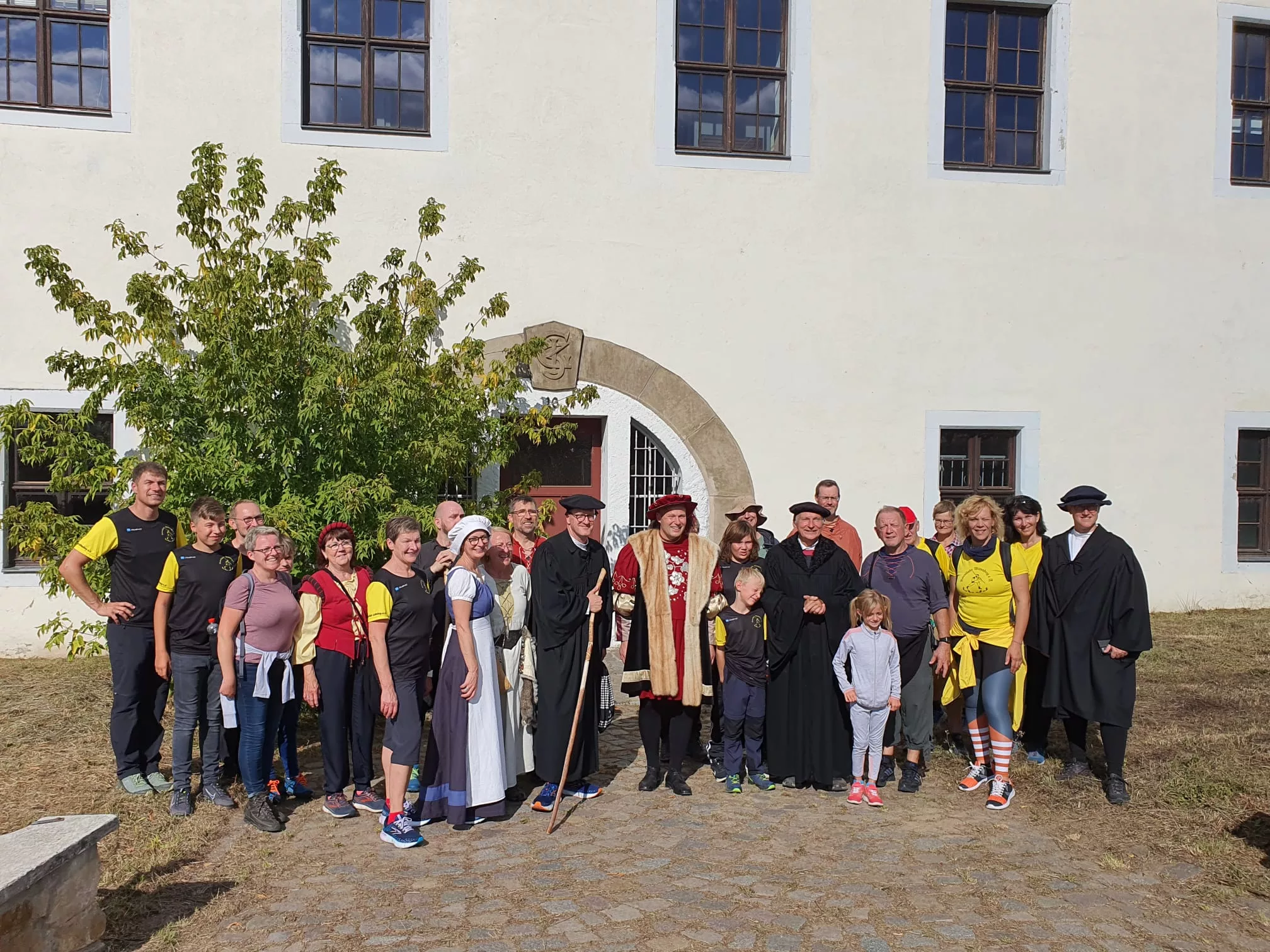 Prettin/Torgau (md). Am Sonntag, dem 24. September 2023 wanderten Oberbürgermeister Torsten Zugehör, historisch gewandet als Johannes Bugenhagen, Bürgermeister André Seidig und Bernhard Naumann alias Martin Luther zusammen mit Mitgliedern des Vereins Botenläufer Wittenberg e.V. und weiteren Begleiter aus der Umgebung von Prettin nach Torgau.
