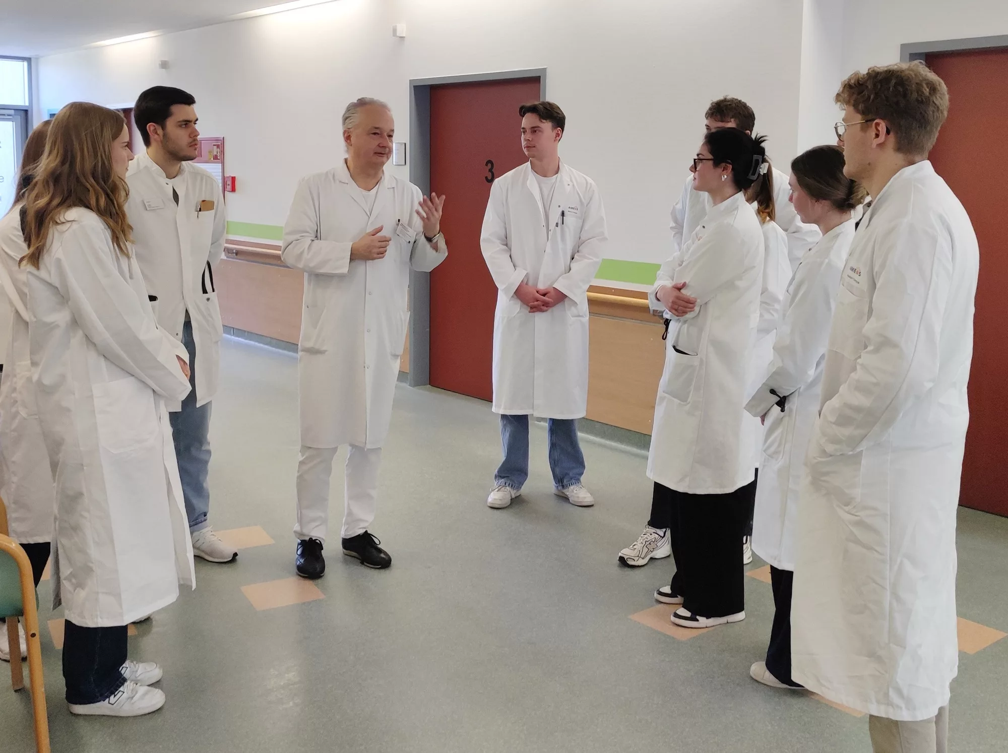 Die Studierenden begleiteten in Coswig die Visiten auf der kardiologischen Station, erhielten Einblicke in den OP und das Herzkatheterlabor und konnten ihr Wissen unter realen Bedingungen vertiefen. Neben der praktischen Ausbildung hielt Dr. Hausmann in Halberstadt Vorlesungen und Seminare im Fach Herzchirurgie. In der kommenden Woche wird er die Prüfungen für die Studierenden auf dem AMEOS Campus Halberstadt abnehmen.