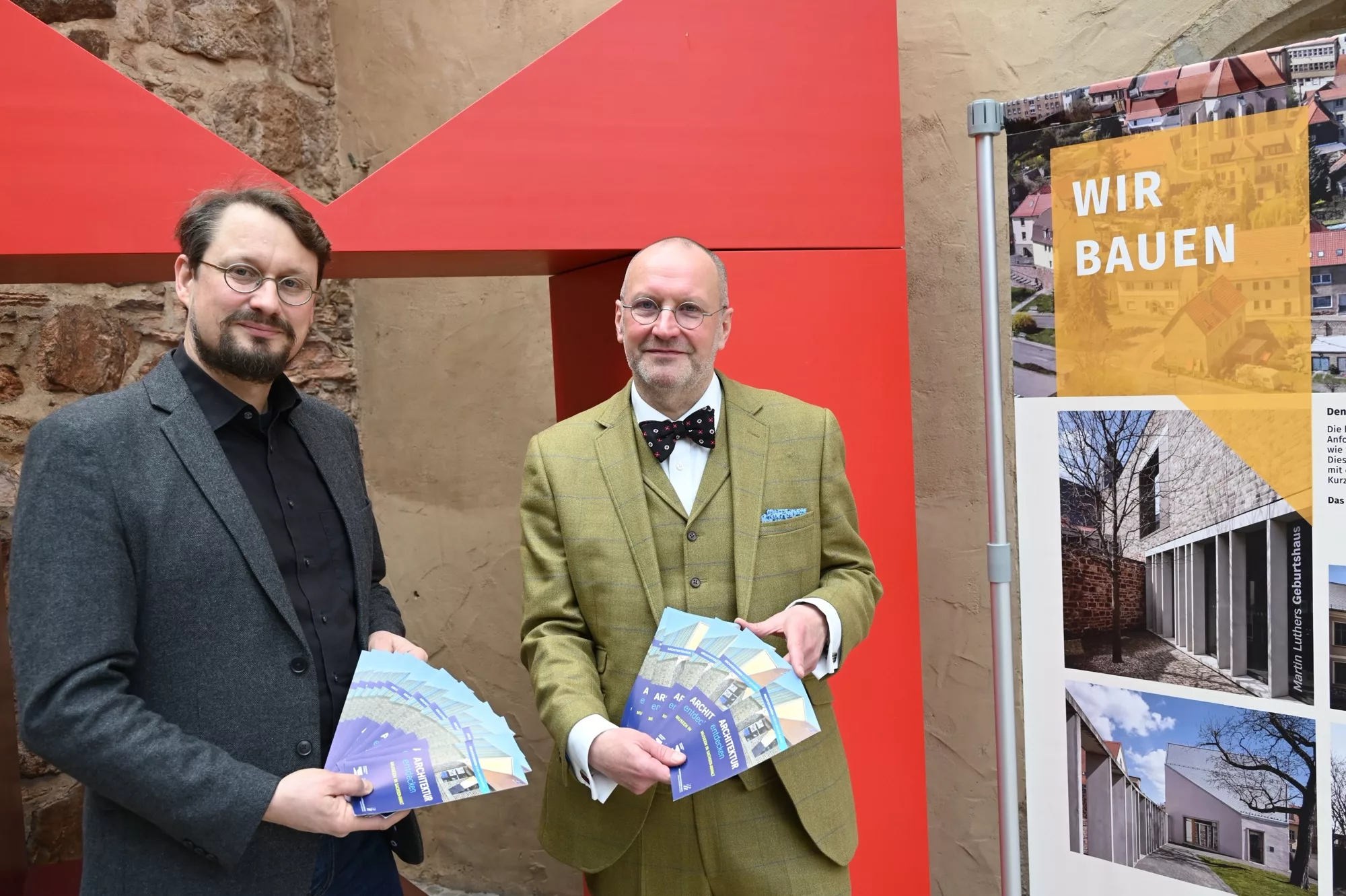 „Die Stiftung Luthergedenkstätten ist eine exzellente Bauherrin, die Architektur und Baukultur aktiv fördert“, betonte André Schlecht-Pesé von der Architektenkammer bei der Übergabe der Faltblätter an Stiftungsvorstand Dr. Thomas T. Müller.
