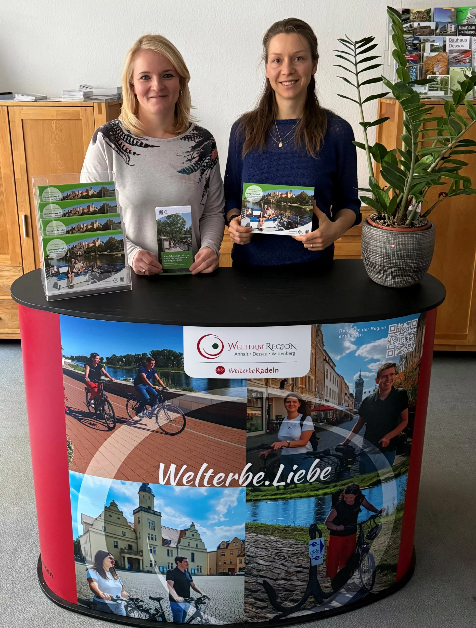 Bild: Anika Kinnemann, Geschäftsführerin des WelterbeRegion Anhalt-Dessau-Wittenberg e.V. und Vanessa Deisinger, Rad- und Aktivbeauftragte des Regionalverbandes, präsentieren die neue R1-Broschüre. Foto: WelterbeRegion ADW e.V.
