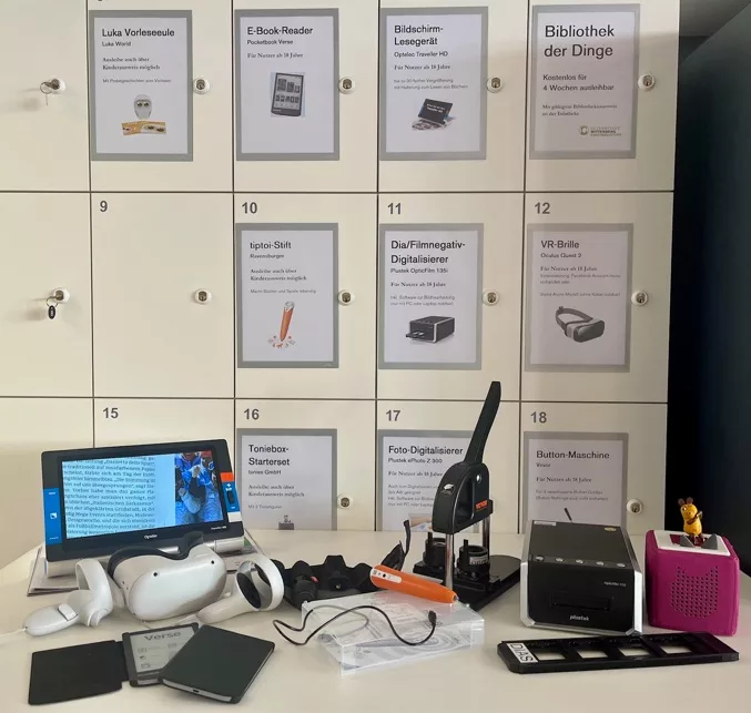 Im Online-Katalog der Stadtbibliothek können Interessierte mit dem Suchbegriff „Bibliothek der Dinge“ nach allen ausleihbaren Gegenständen recherchieren. Der Fokus liegt auf digitalen Geräten, die von allen Nutzern ab 18 Jahren kostenlos ausgeliehen werden können, digitale Geräte für Kinder sind über den Nutzerausweis der Kinder verfügbar. Die „Bibliothek der Dinge“ ist in den Schließfächern Eingang Schlossstraße integriert.