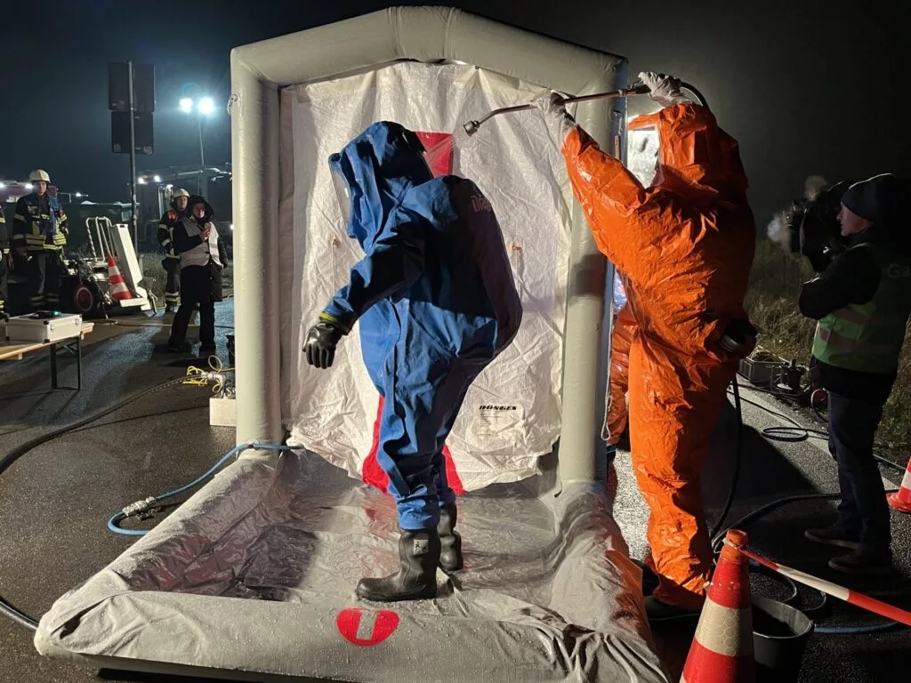 Am 6. November fand eine Katastrophenschutzübung mit 100 Einsatzkräften auf einem Autobahnparkplatz an der A9 statt. Geübt wurde ein Gefahrgutunfall unter schwierigen Bedingungen.