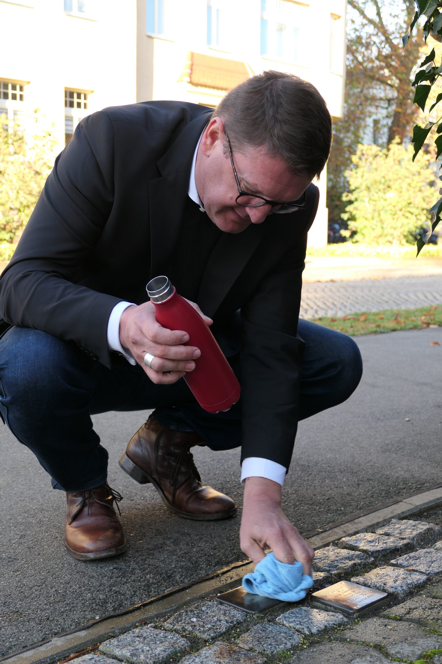 Bild: Aus Anlass des Gedenktages an die Pogromnacht 1938 hat sich Oberbürgermeister Torsten Zugehör an der diesjährigen Putzaktion der Wittenberger Stolpersteine beteiligt. Foto: Stadtverwaltung