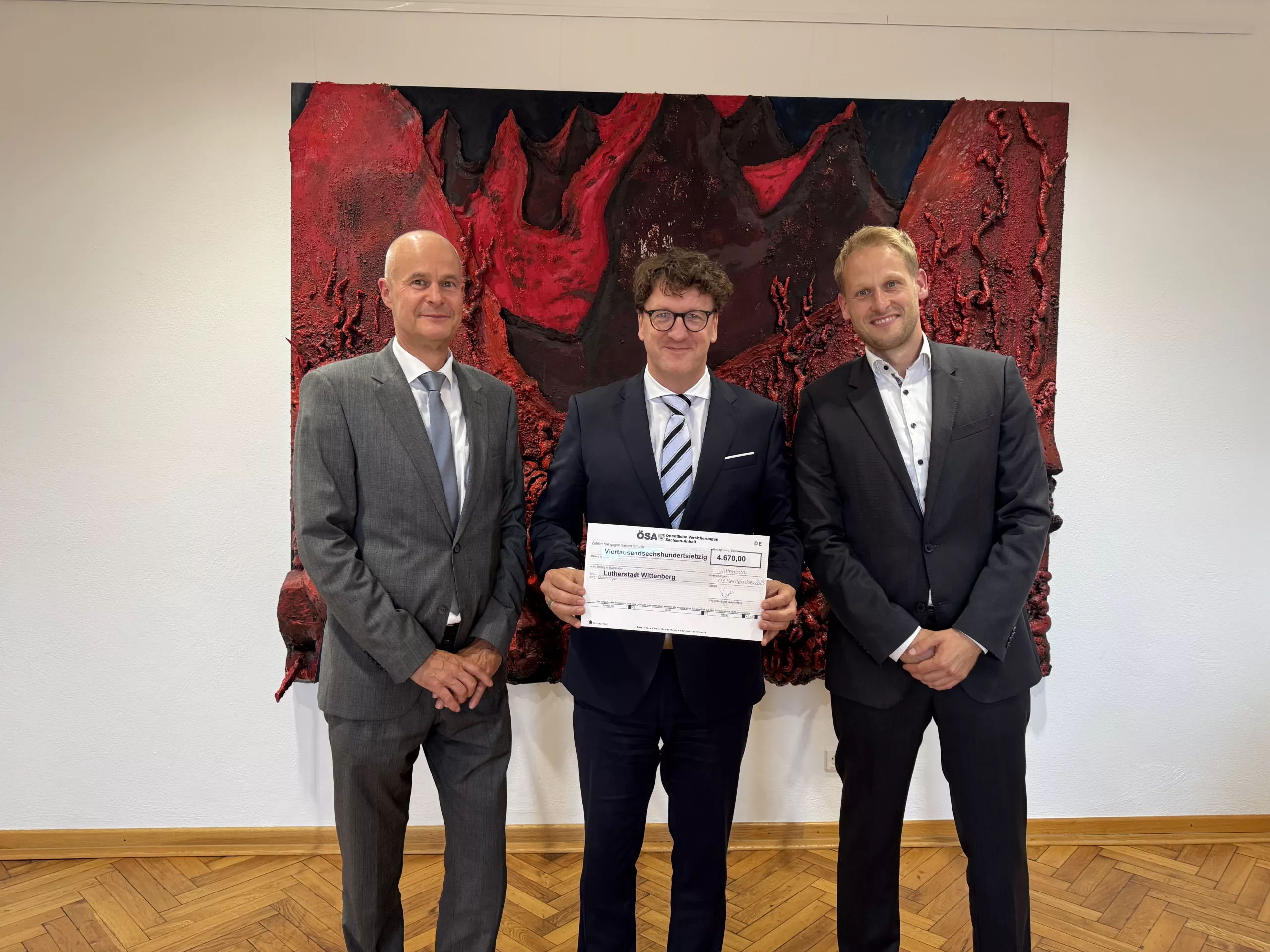 Wittenberg (md). Mit einer Finanzspritze über 4.670 Euro belohnen die Öffentlichen Versicherungen Sachsen-Anhalt (ÖSA) die erfolgreiche Schadenprävention der Stadt Wittenberg. Aufgrund ihrer geringen Schadenquote in 2024 wird die Stadt am wirtschaftlichen Erfolg der ÖSA beteiligt. Den symbolischen Scheck übergaben Ralf Fincke, Vorstand der Sparkasse Wittenberg, und Kevin Böttcher, Mitarbeiter des Verbundcenters der Sparkasse Wittenberg, heute an Wittenbergs Oberbürgermeister Torsten Zugehör.