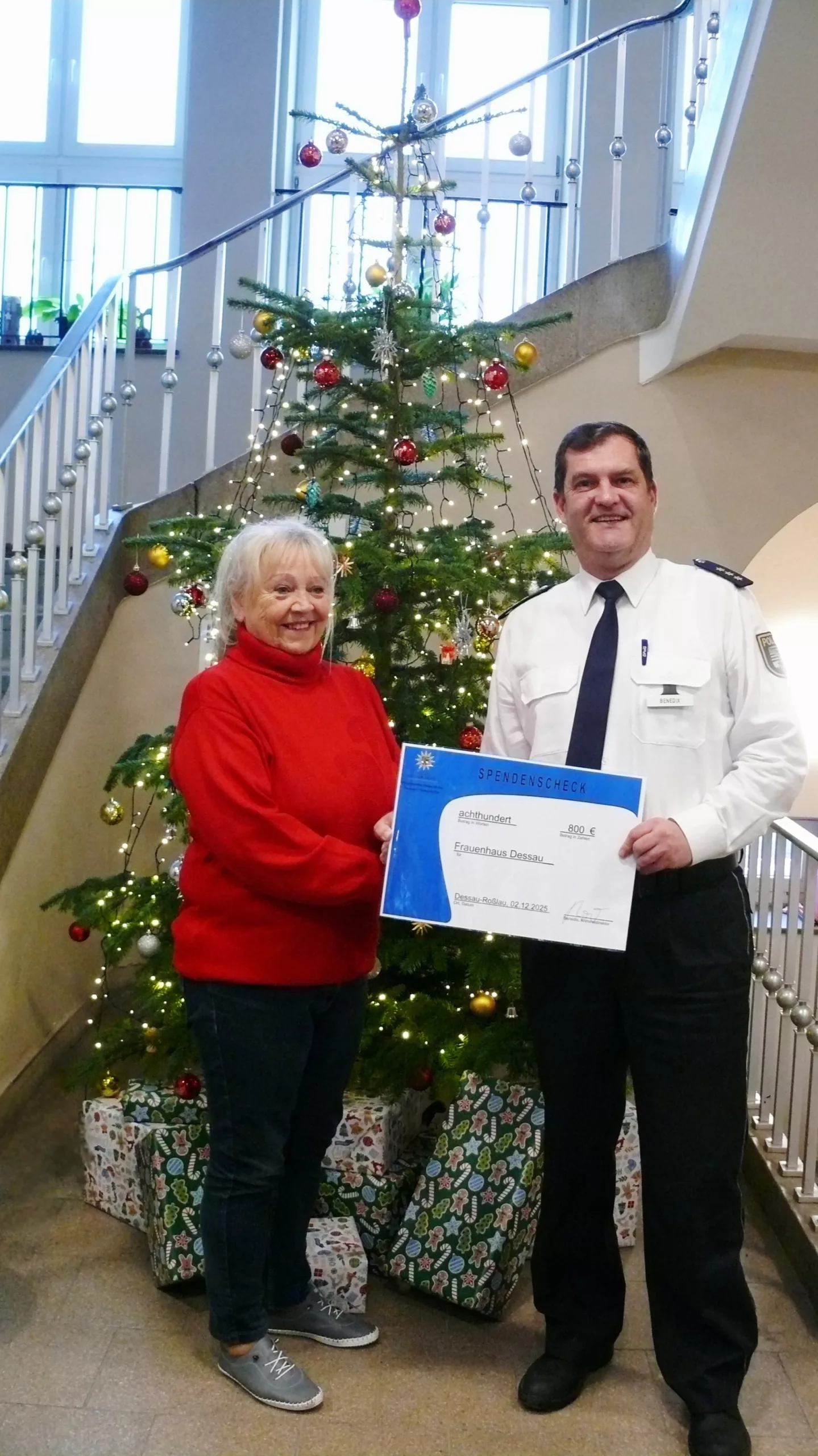 Im Polizeirevier erfolgte die feierliche Übergabe des symbolischen Schecks sowie der Spende. In einem kurzen Austausch mit dem Revierleiter bedankten sich die Frauenhausmitarbeiterinnen herzlich für die gute Zusammenarbeit, für die Organisation des Konzertes, das Engagement der Mitwirkenden und die große Spendenbereitschaft der Besucher. Auch das im nächsten Jahr stattfindende vorweihnachtliche Benefizkonzert in der Marienkirche in Dessau-Roßlau befindet sich bereits in der Planungsphase. Als Termin kann bereits jetzt der 23. November 2026 vorgemerkt werden. In den Folgejahren ist angedacht, den Termin für das Konzert jeweils auf den Montag vor dem 1. Advent zu legen.